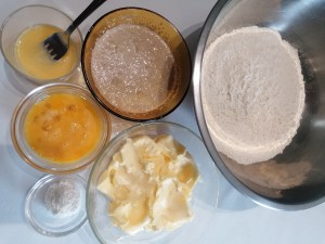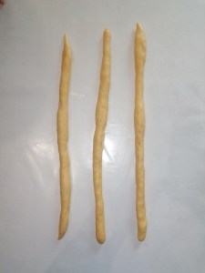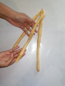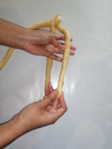 Après une bonne heure de repos on va pétrir légèrement la pâte et former des pains nattés ou des pomme-cannelle, puis les laisser reposer 15 minutes.