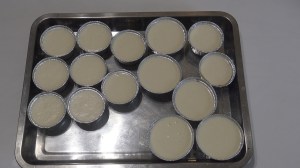 Garnir les moules, et les disposer dans un plateau bien creux, ou un autre récipient allant au four, verser de l’eau (chaude si possible) dans le plateau et cuire les flans pendant environ 30 minutes.