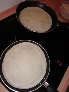 Mettre une crêpière ou une poêle à chauffer à feu moyen (j’en mets 2 en même temps). Après repos, la pâte se sera surement séparée, il faut la mélanger rapidement et cuire les crêpes en pensant à les retourner pour que leur cuisson soit bien uniforme.