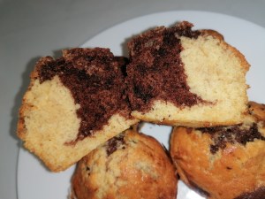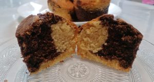 Beurrer un moule à muffin (ou tout autre moule à votre disposition) et alterner les couches de pâte vanillée et de pâte chocolatée.