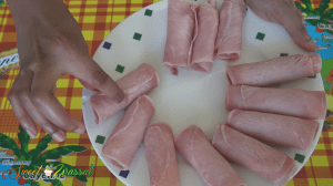 Mettre deux tranches de jambon une sur l’autre pour obtenir un rectangle, si vos tranches de jambon sont déjà grandes ce n’est pas la peine de faire cette étape.