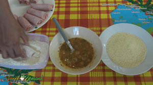 Préparer la panure : battre vigoureusement les œufs avec les épices (si vous le souhaitez, vous pouvez ajouter un peu d’eau), disposer la farine et la chapelure dans des plats séparés.