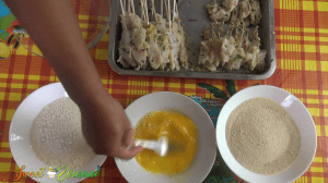 Bien fariner les brochettes puis les passer dans l’œuf et enfin dans la chapelure.