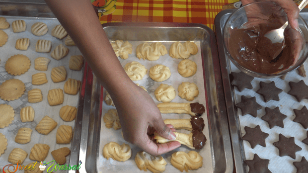 Une fois tous les biscuits refroidis, en garnir certains de confiture et verser un petit filet de chocolat fondu sur les autres.