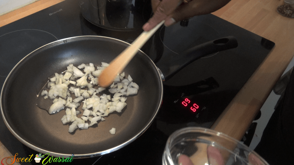 Pendant ce temps, préparer la béchamel en faisant revenir l’oignon émincé dans l’huile,