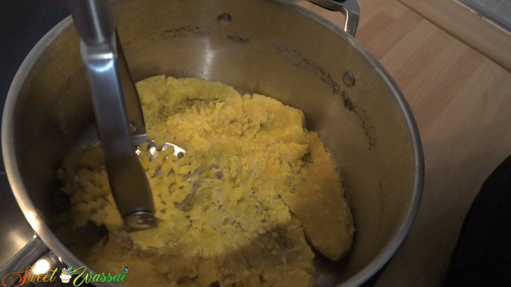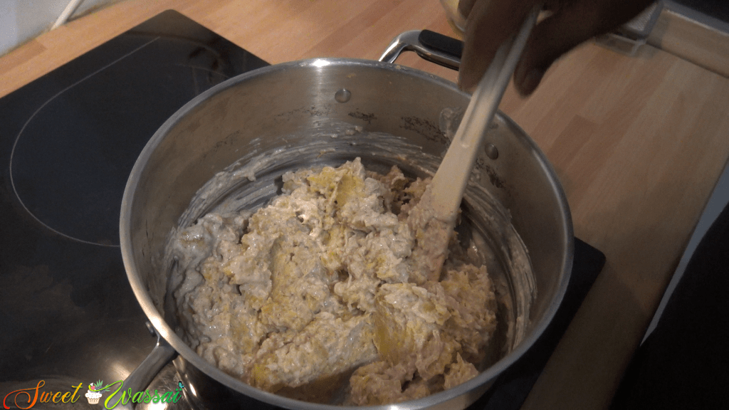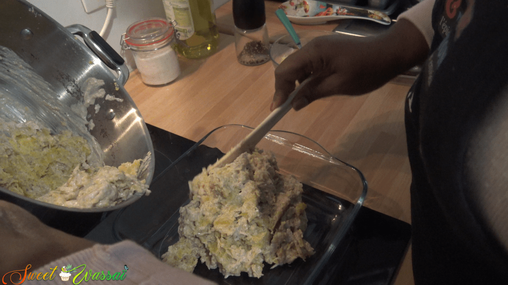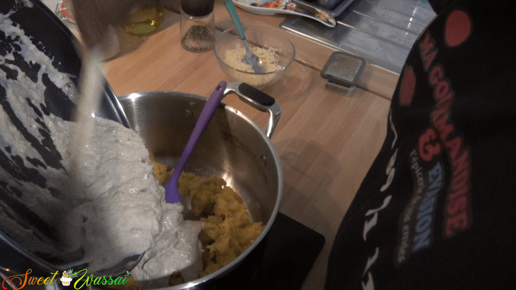 Une fois les bananes cuites, les écraser et y verser la béchamel