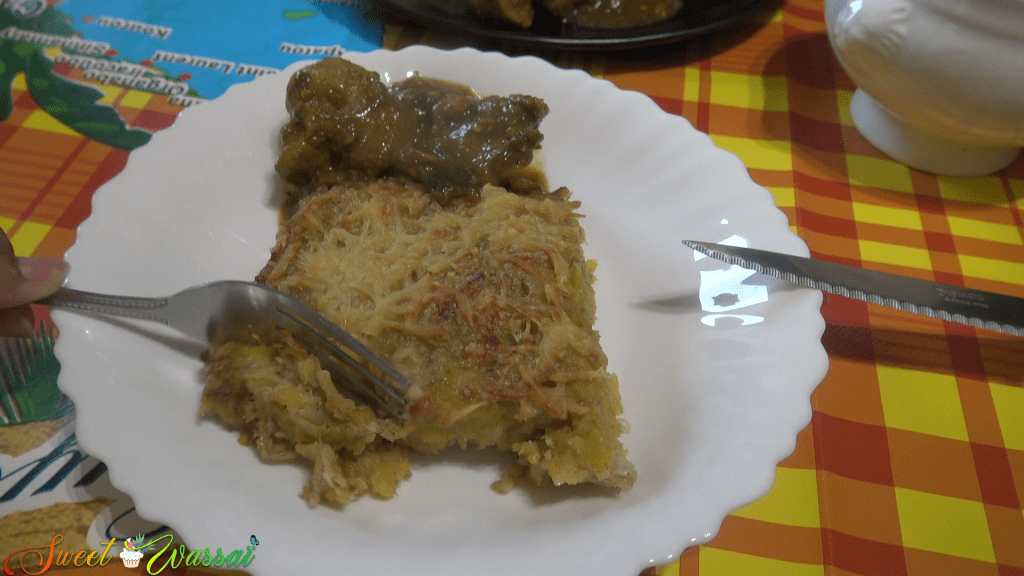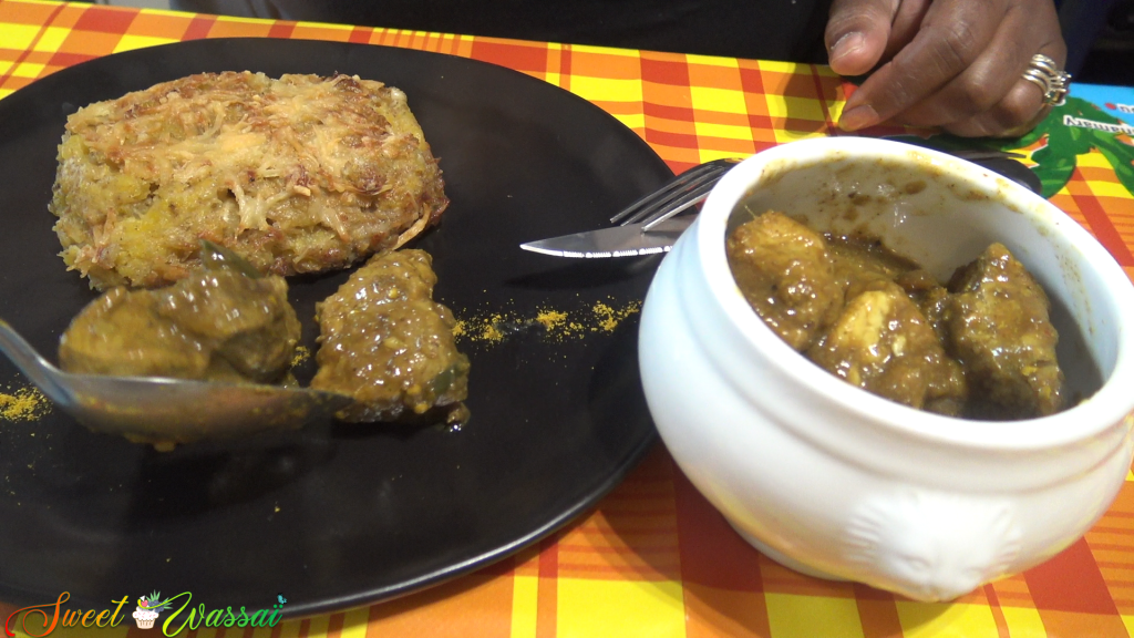 Ce gratin peut être accompagné de toutes sortes de viandes et de poissons, ici Manuella a choisi du colombo de porc.