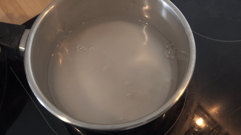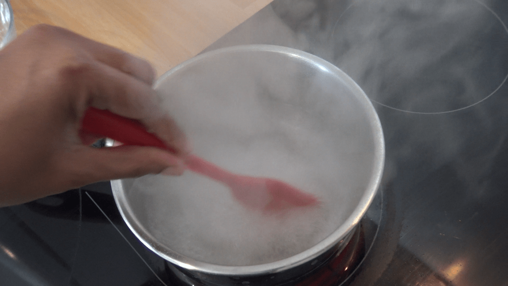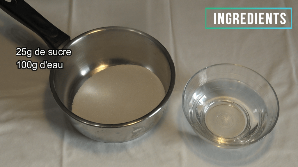 Mettre l’eau et le sucre dans une casserole et faire cuire à feu moyen jusqu’à ce que tout le sucre ait fondu ou à 95° max.