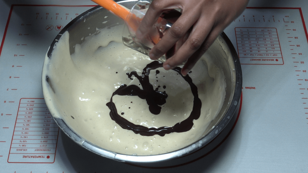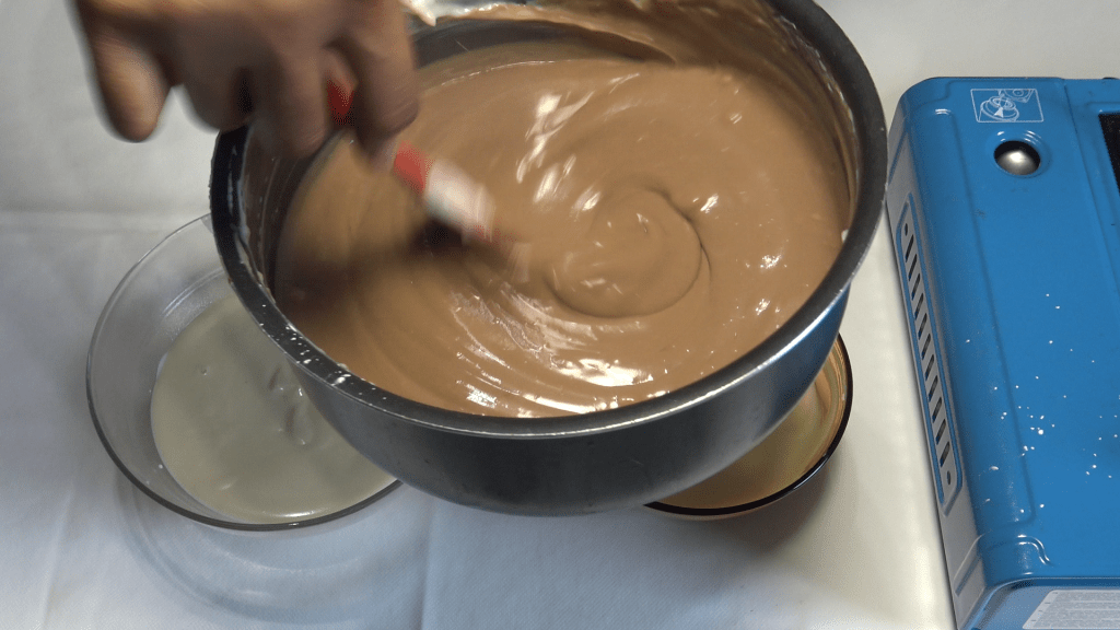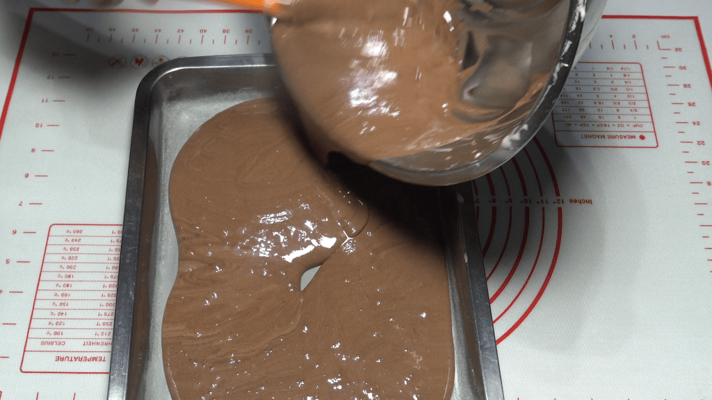 Préparer la génoise, séparer la pâte en 2 et ajouter dans une moitié le cacao délayé dans un peu d’eau chaude,