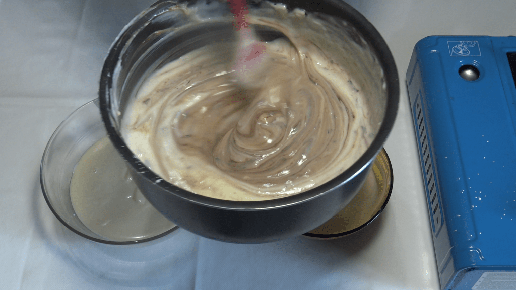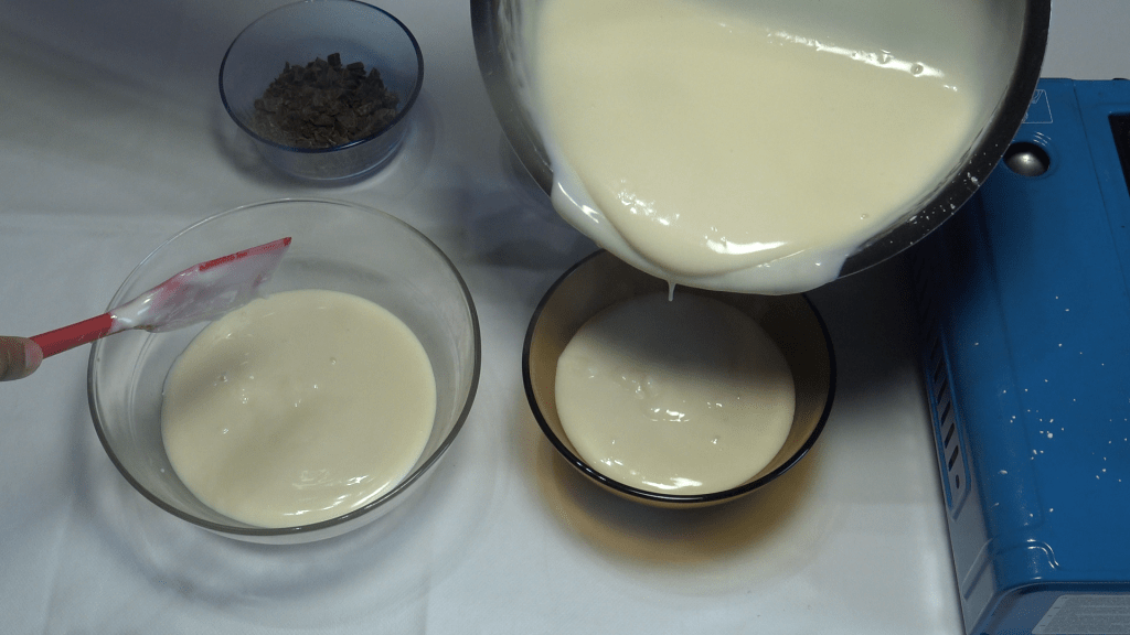 Séparer la crème en 3 parties, ajouter le chocolat haché dans la première et bien mélanger pour qu’il fonde complétement, puis la vanille dans la seconde partie et enfin le coco dans la 3e partie. On peut faire grillé le coco pour plus de saveur.