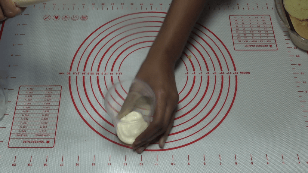 Et aussi il faut utiliser les chutes de génoises même si elles ne sont pas rondes, il suffit d’en mettre plusieurs bouts.