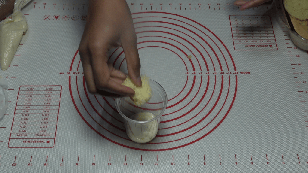 Découper des ronds de génoises et commencer le montage des gâteaux en pots