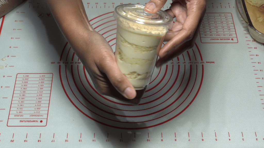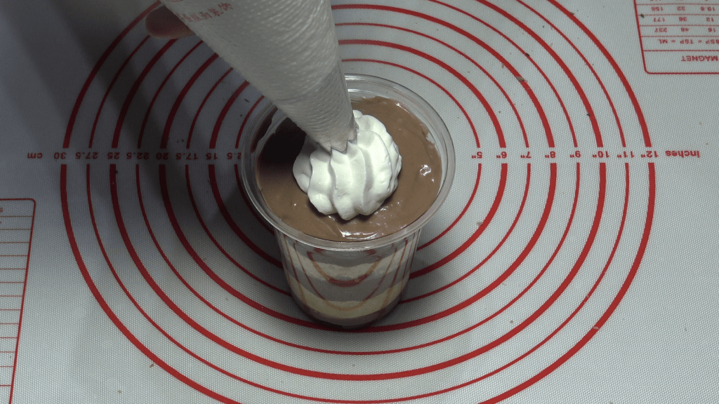 Mettre une couche de crème dans le fond du pot puis une couche de génoise, et imbiber de sirop