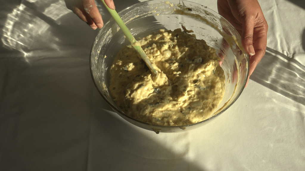Ajouter le lait et l’huile, ainsi que les olives et le fromage râpé et mélanger à nouveau rapidement