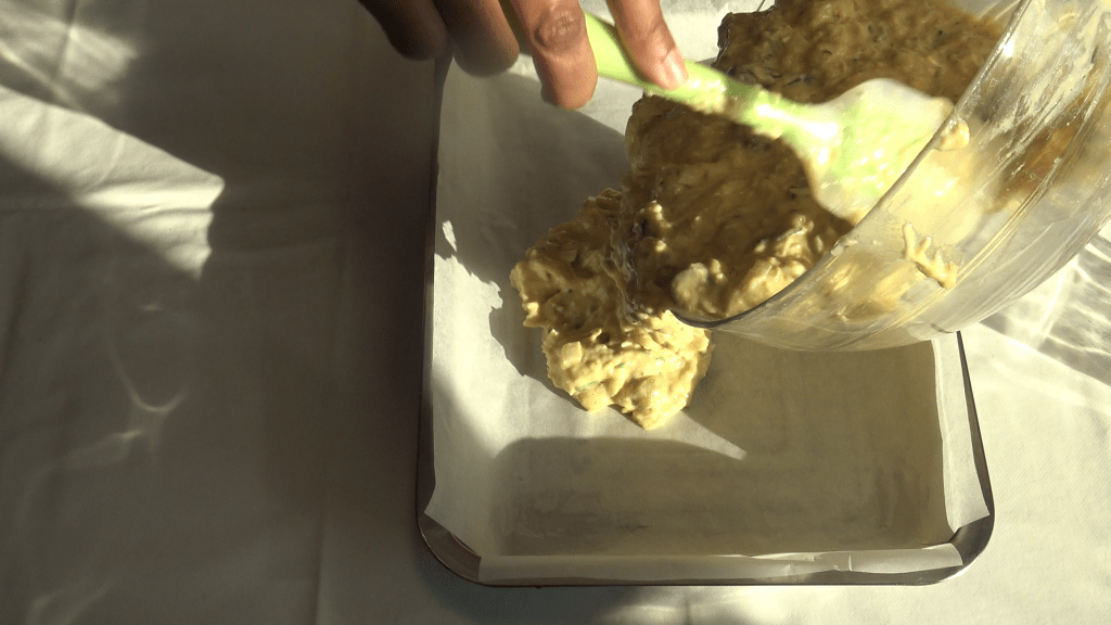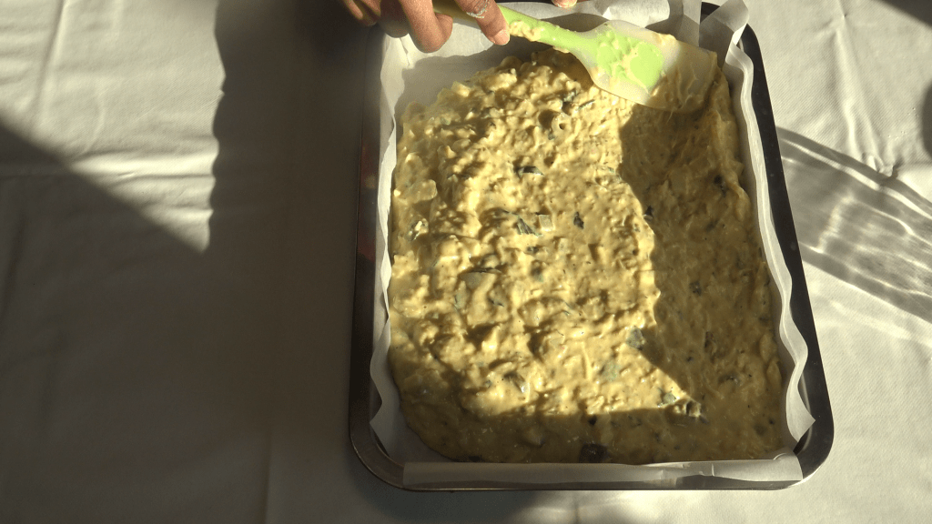 Verser la pâte dans un moule carré ou rectangulaire d’environ 30×30 cm (selon ce que tu as sous la main)