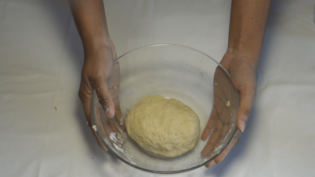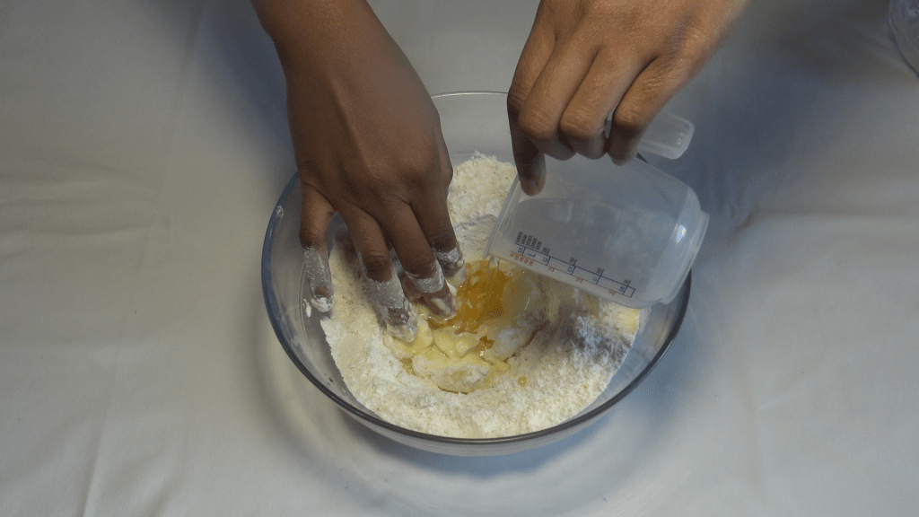 Ajouter l’œuf et le beurre puis l’eau petit à petit et mélanger pour former une boule