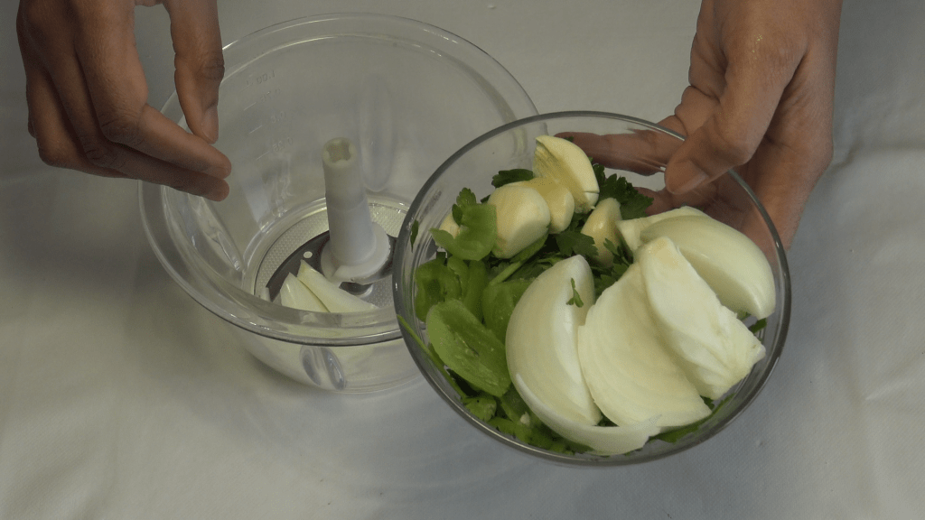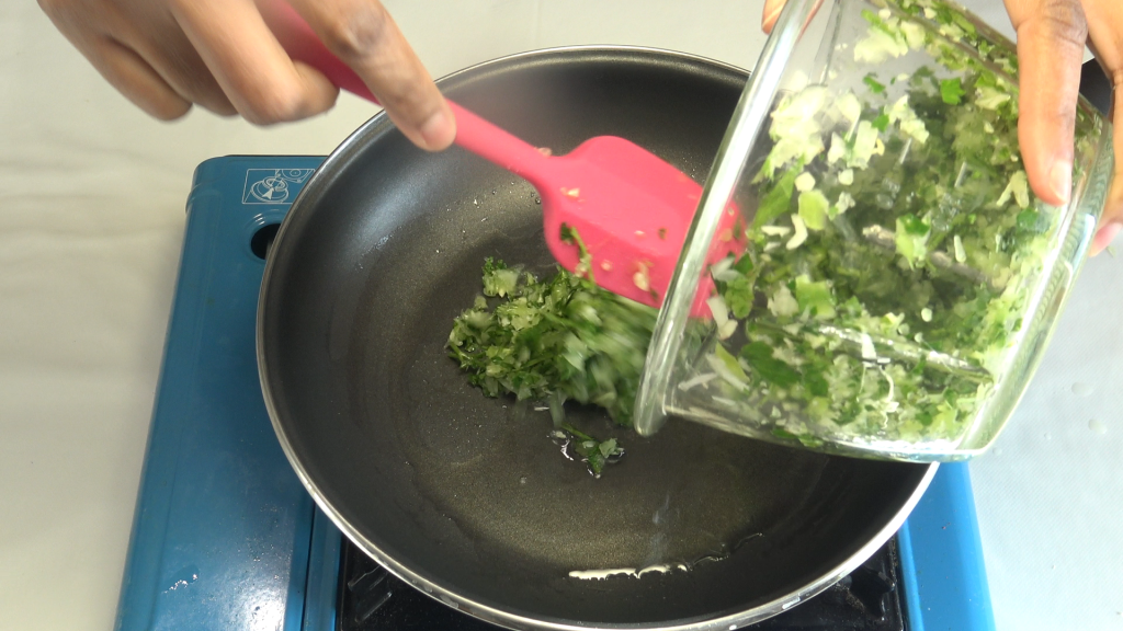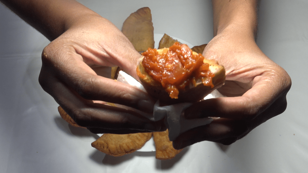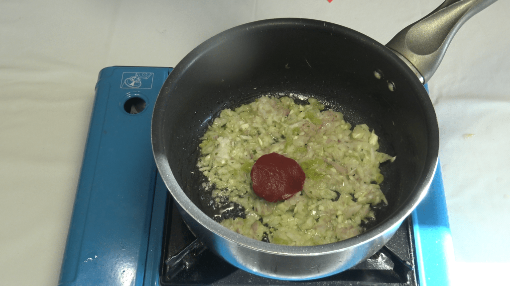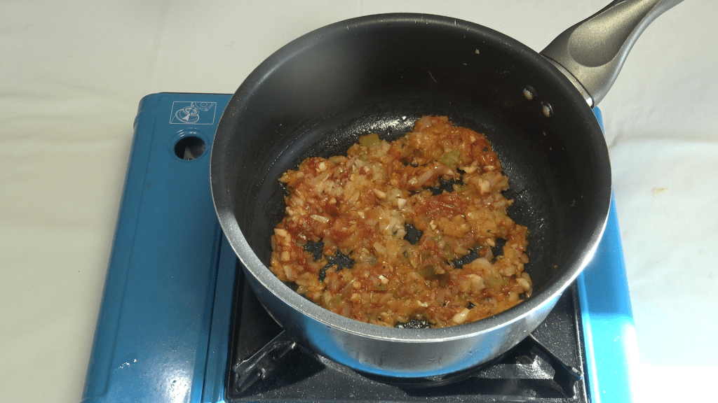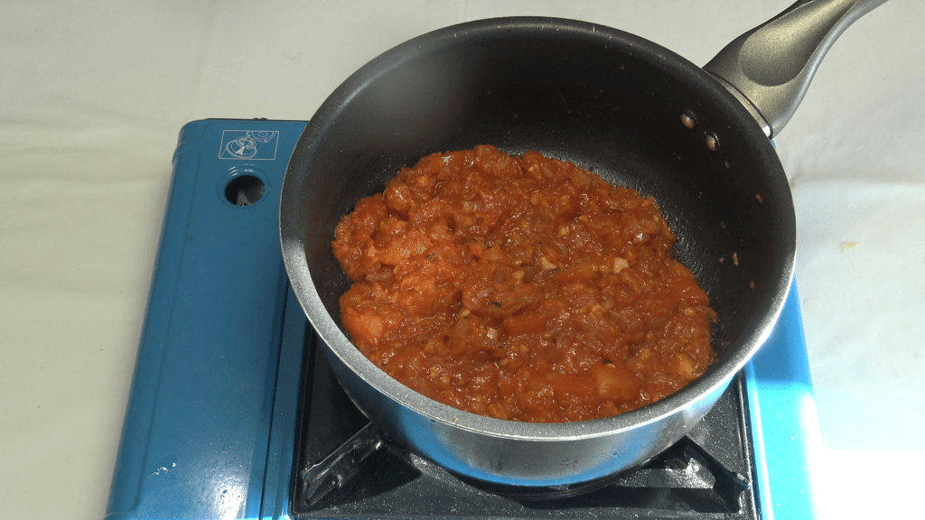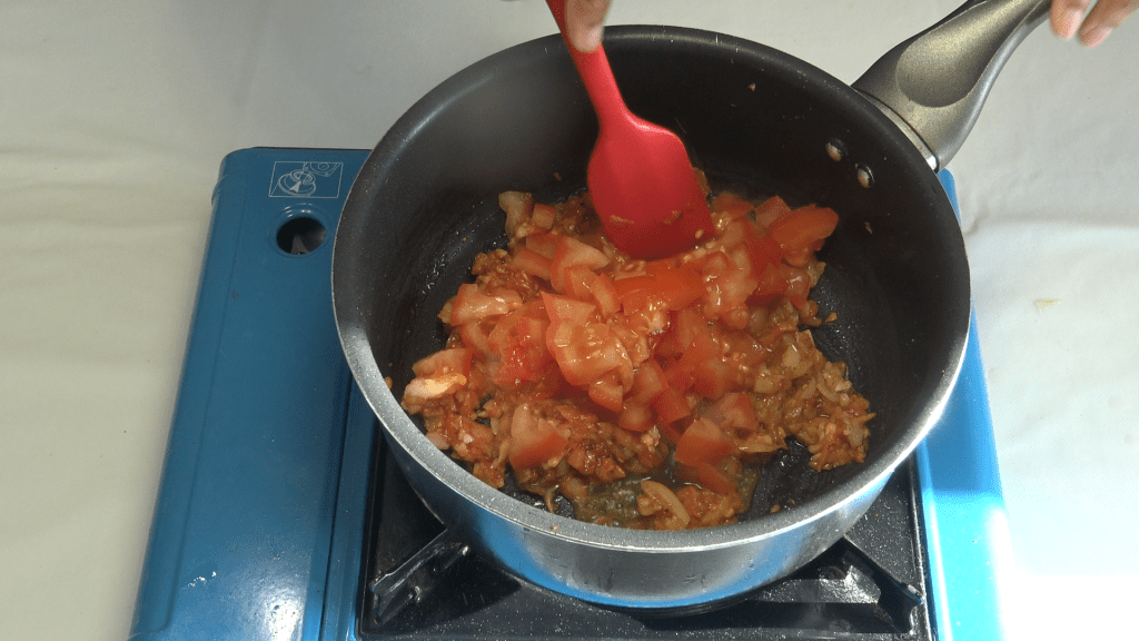 Alors pour la sauce, faire dorer les oignons et ajouter l’ail, le piment, le sel et le poivre, cuire quelques minutes et enfin ajouter la tomate coupée en morceaux et cuire encore 10 minutes pour faire compoter.