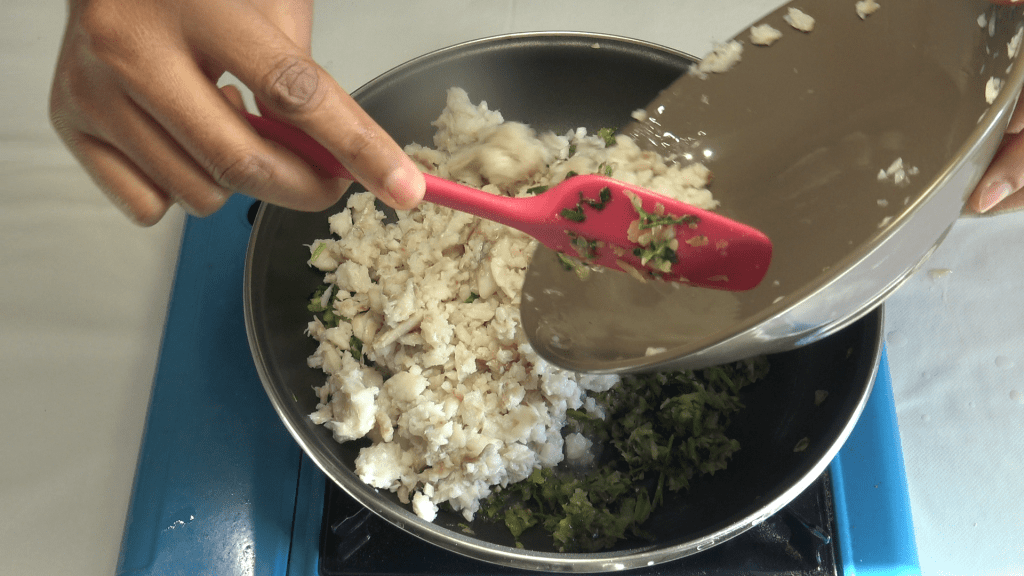 Mixer les aromates, le sel et le poivre, les faire revenir 5 minutes, incorporer le poisson et bien mélanger le tout.