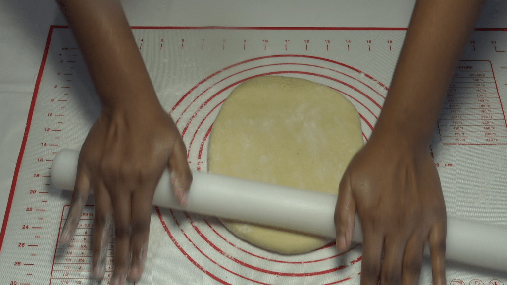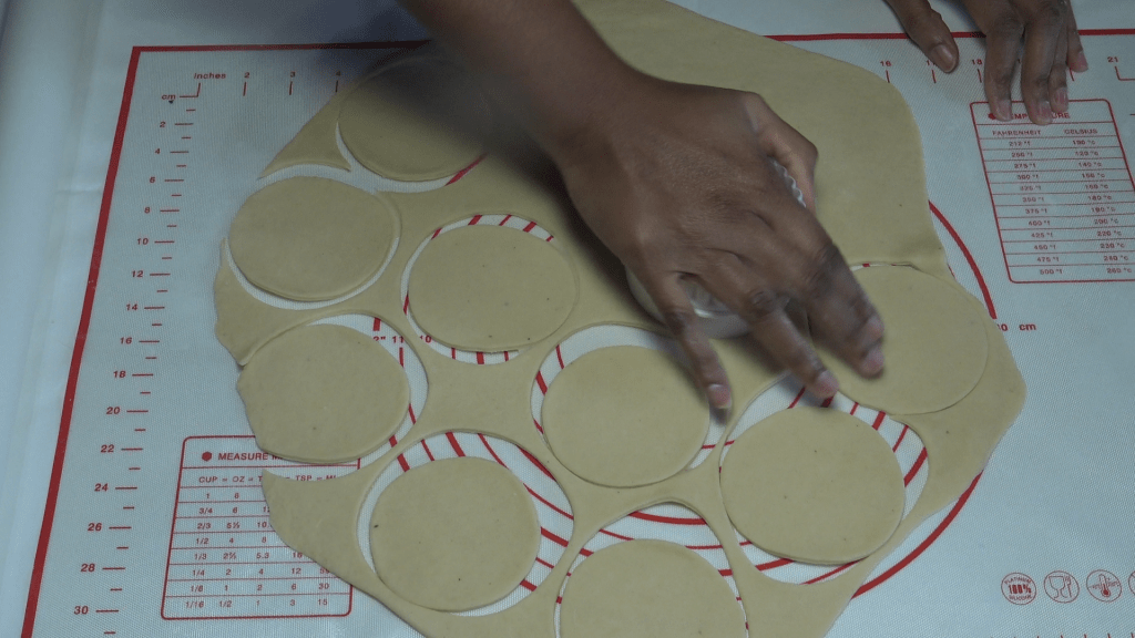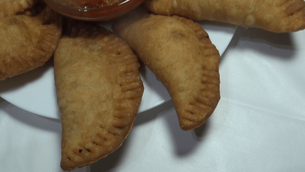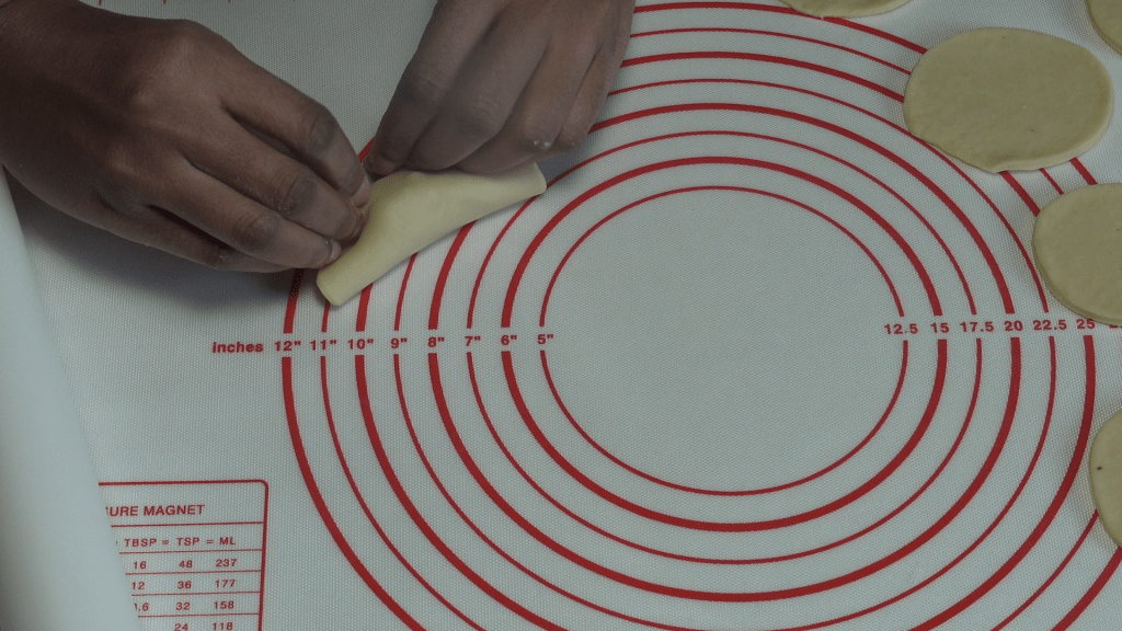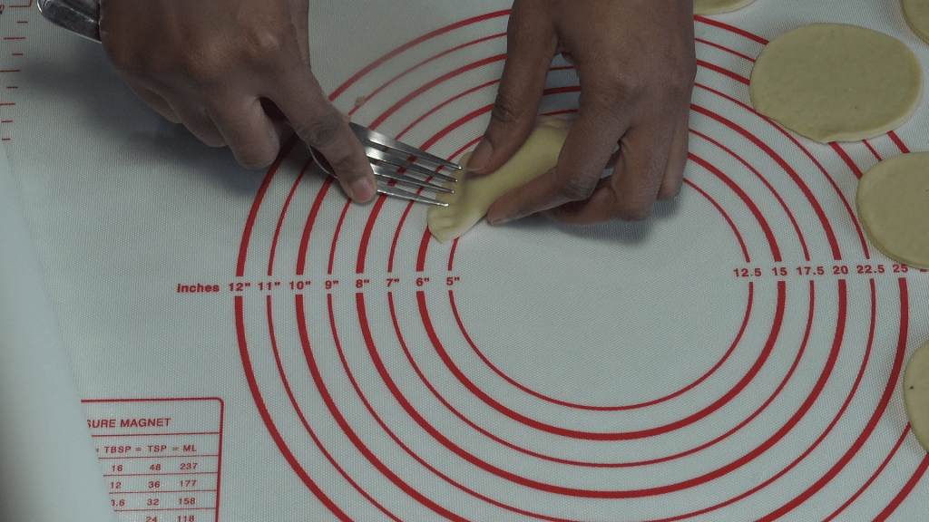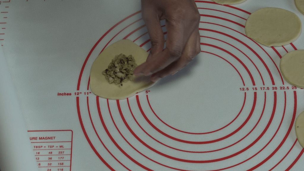 Pendant ce temps, étaler la pâte finement et farcir de poisson, mettre de l’eau sur les bords et souder à l’aide d’une fourchette.