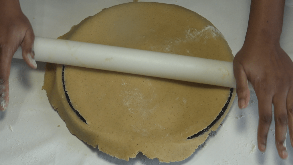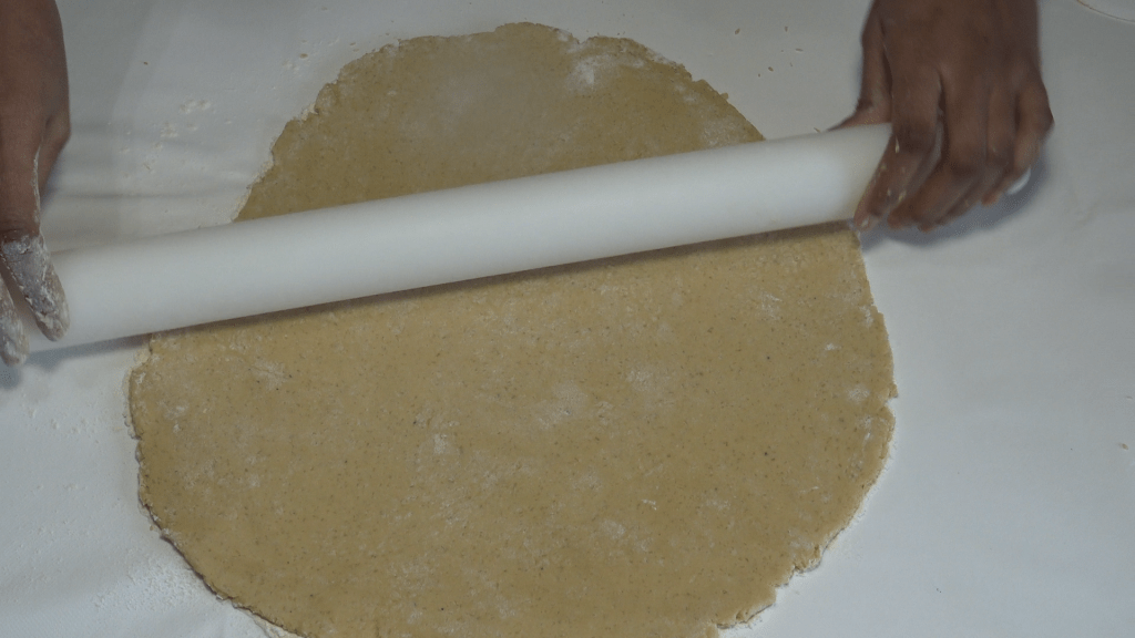 Fariner le plan de travail et étaler la 1ere moitie de pate