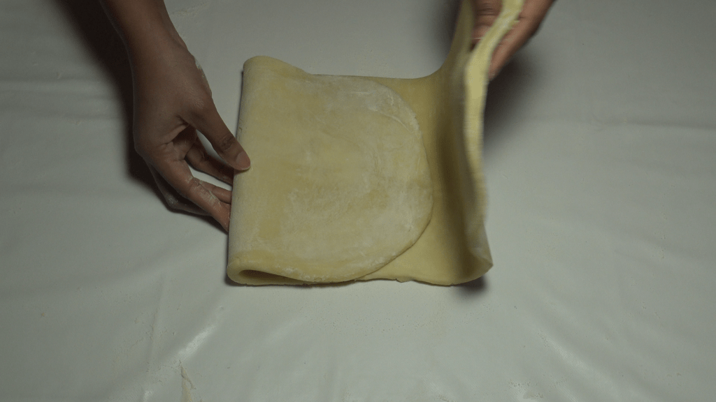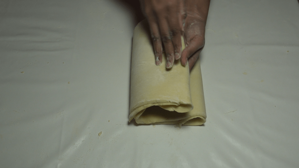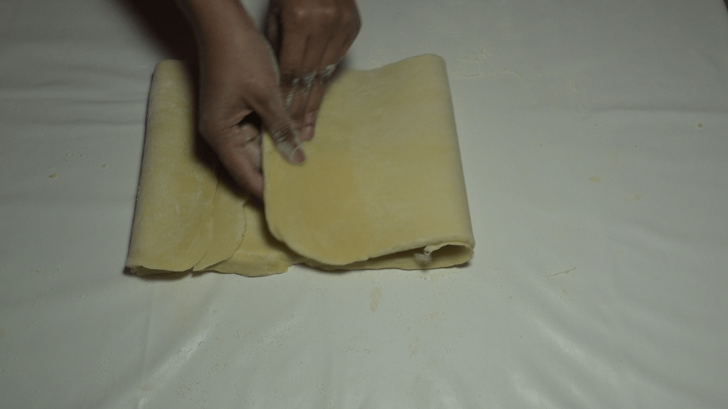 Donner un tour simple (replier la pâte en 3 sur elle-même) puis l’étaler à nouveau en veillant à garder la clé (la fermeture) sur la droite.