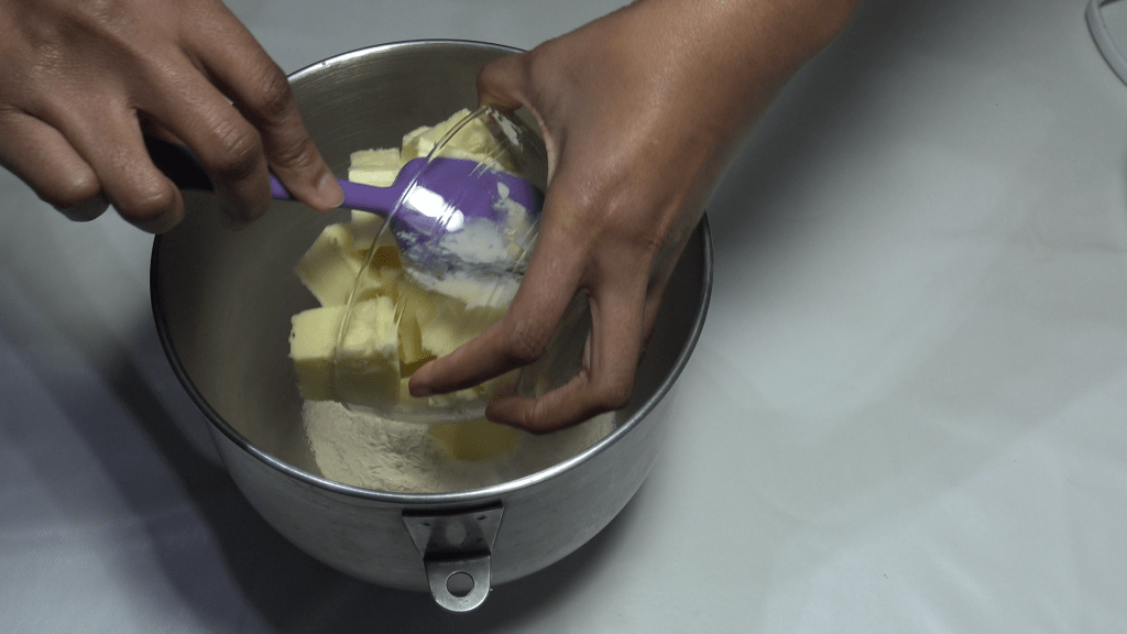 Commençons par préparer le beurre manié, en mélangeant les 150g de farine avec les 375g de beurre sec froid.