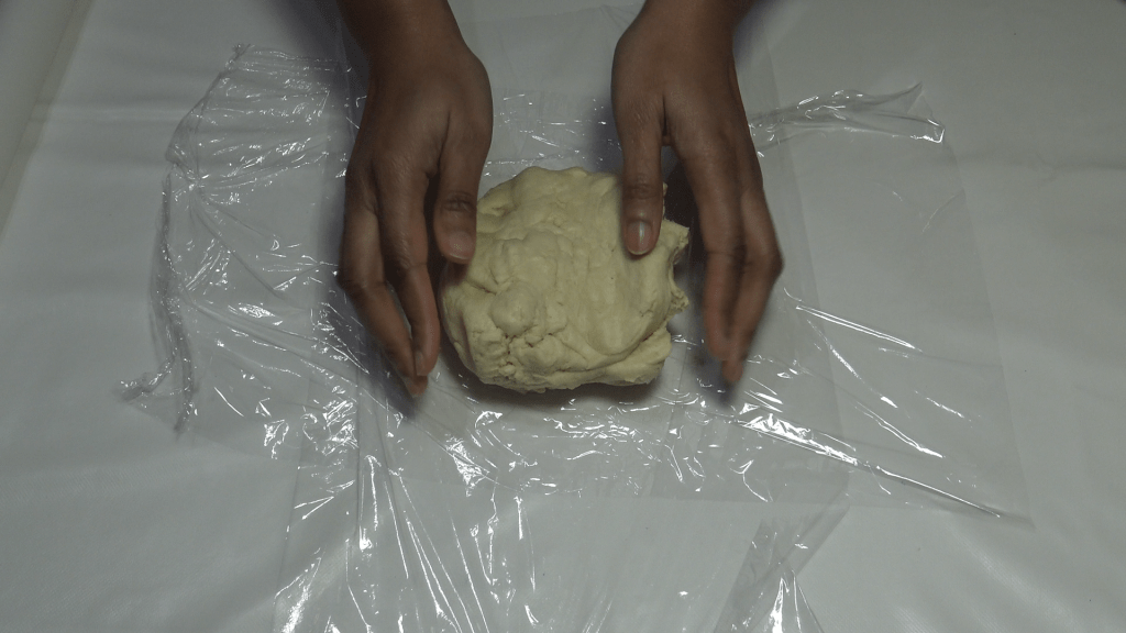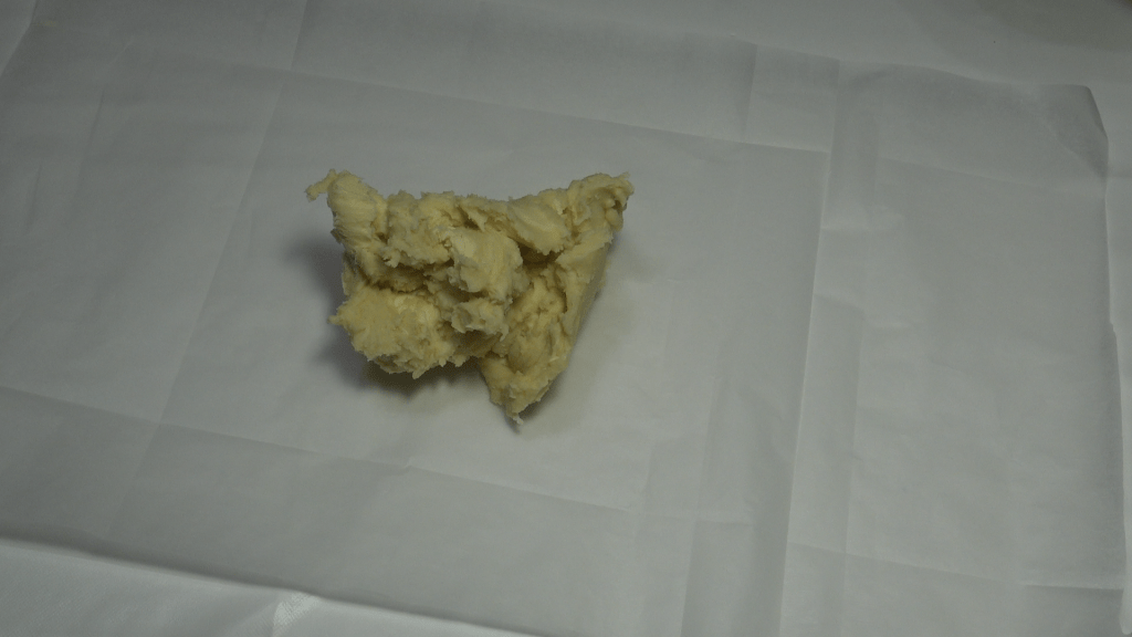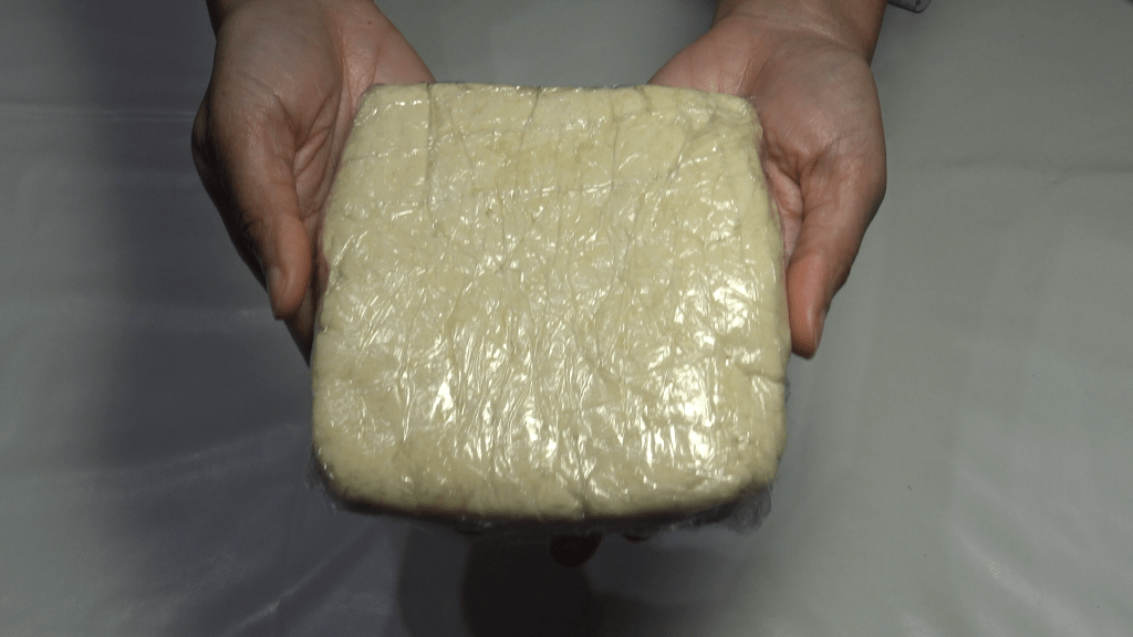 Former un carré d’environ 15x15cm de cotés et mettre 1h au frais enveloppé dans du film alimentaire ou un sac congélation.