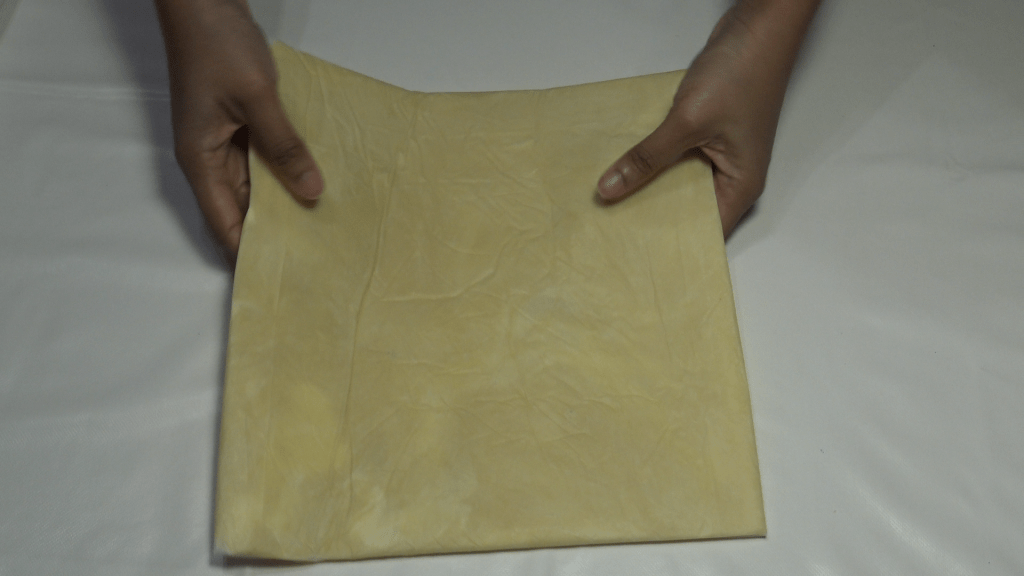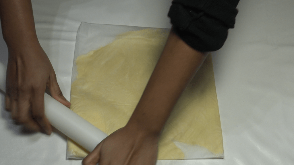 Disposer le beurre manié sur une feuille de papier cuisson en forme de carré (ici 30x30cm) et mettre au frais pendant 1h.