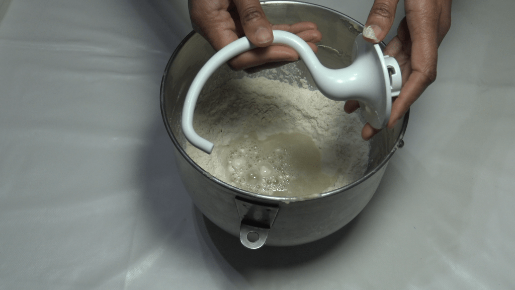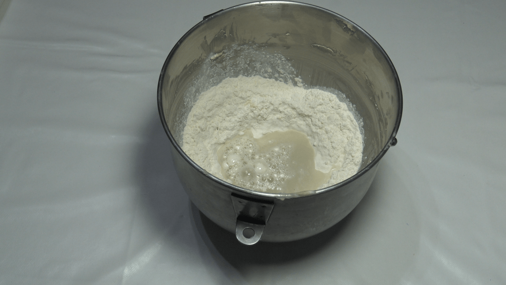 Préparer la détrempe : dissoudre le sel dans l’eau et le vinaigre, mélanger à la farine en ajoutant le beurre fondu refroidi.