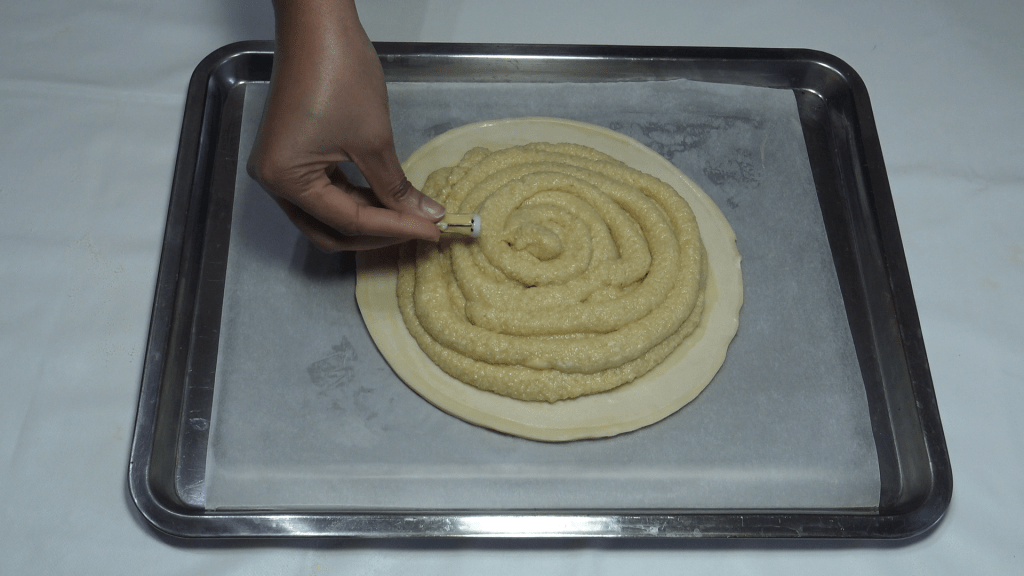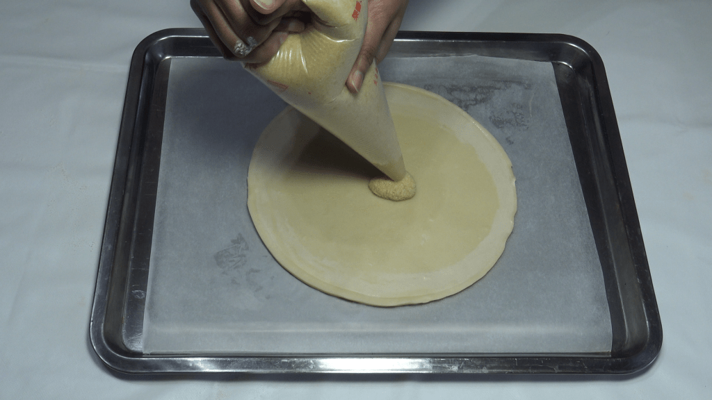 Mettre de l’eau sur les bords pour faciliter la soudure plus tard, garnir de crème frangipane en laissant 3 cm de bordure.