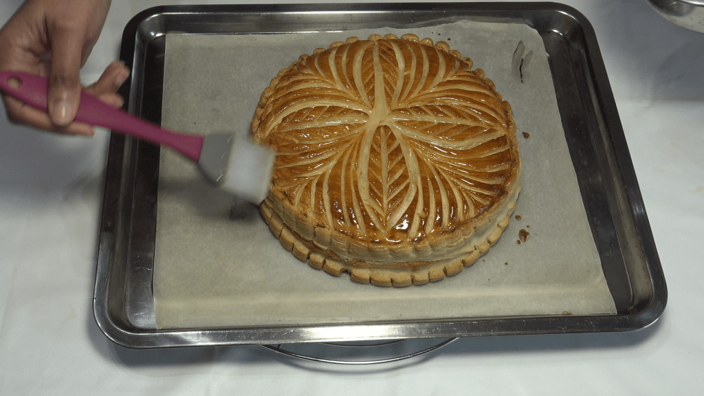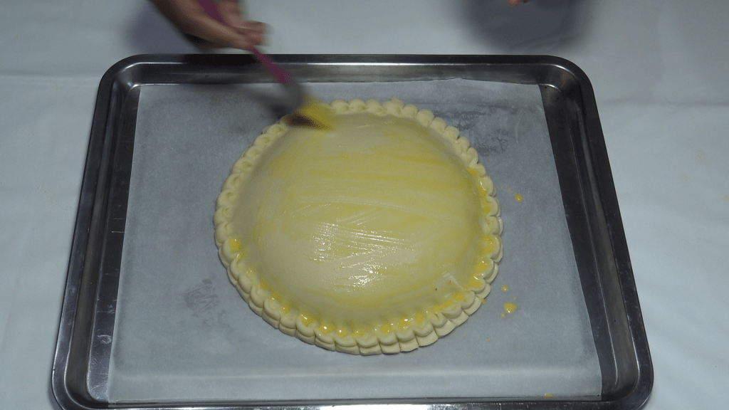 Sortir la galette du frigo et la dorer une seconde fois, puis faire des formes sur le dessus avec une lame sans trop appuyer bien sûr.