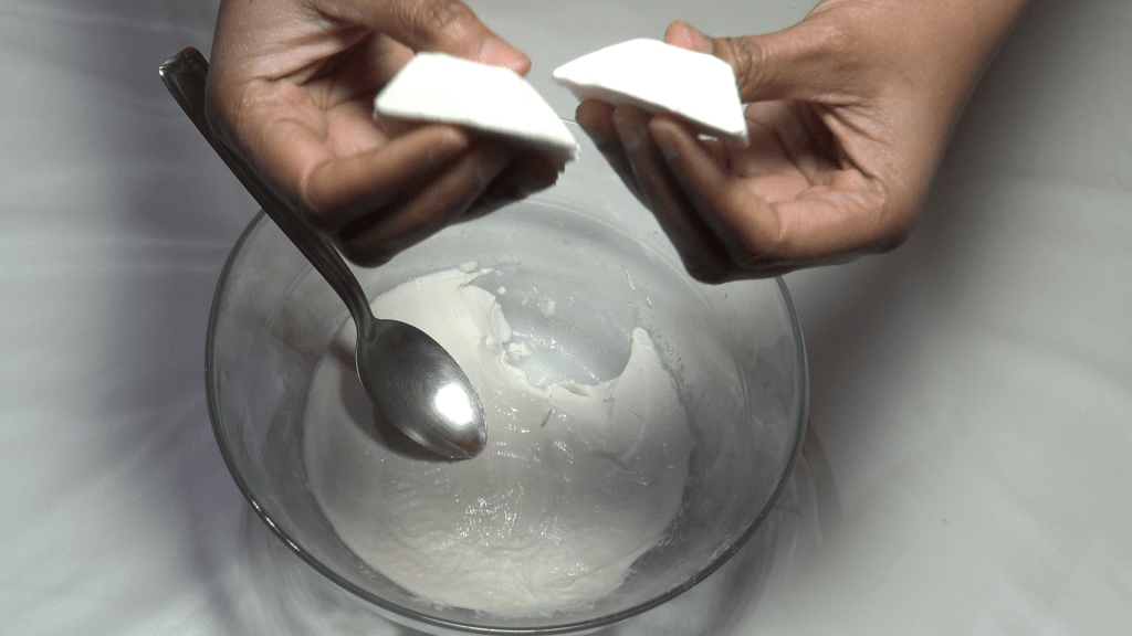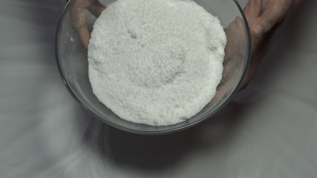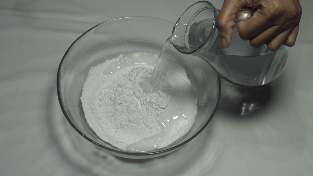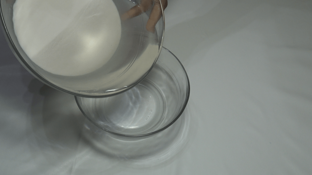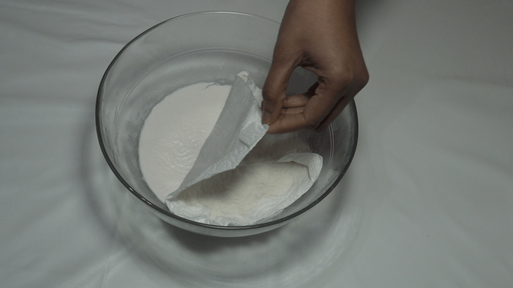 Le lendemain, l’eau et la fécule se sont bien séparées, jeter l’eau et éponger le surplus avec du papier absorbant ou un linge propre.