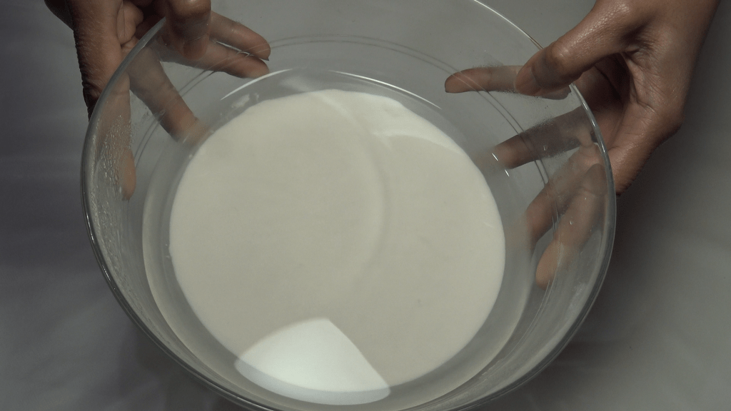 Mettre les 250g de fécule de manioc dans un grand bol et verser de l’eau dessus pour bien recouvrir le tout.