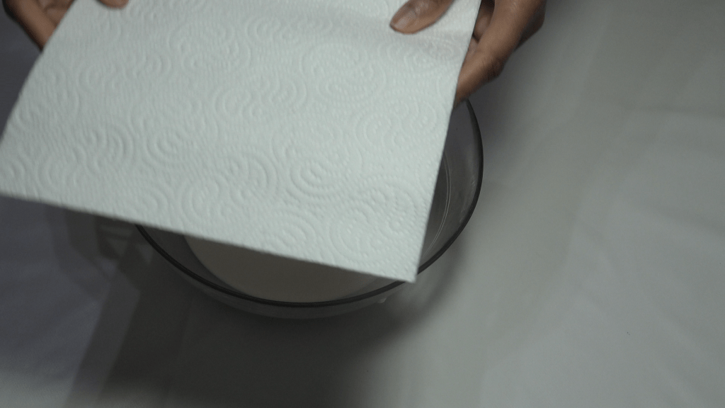 Tu peux également verser la fécule directement sur le linge pour être sûr que le tout sera bien égoutté.