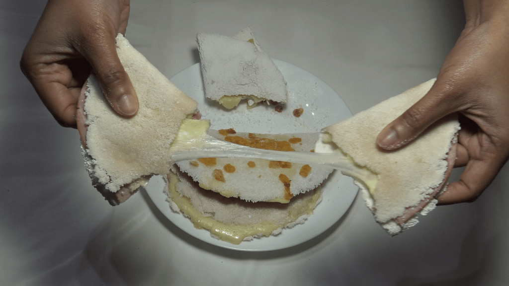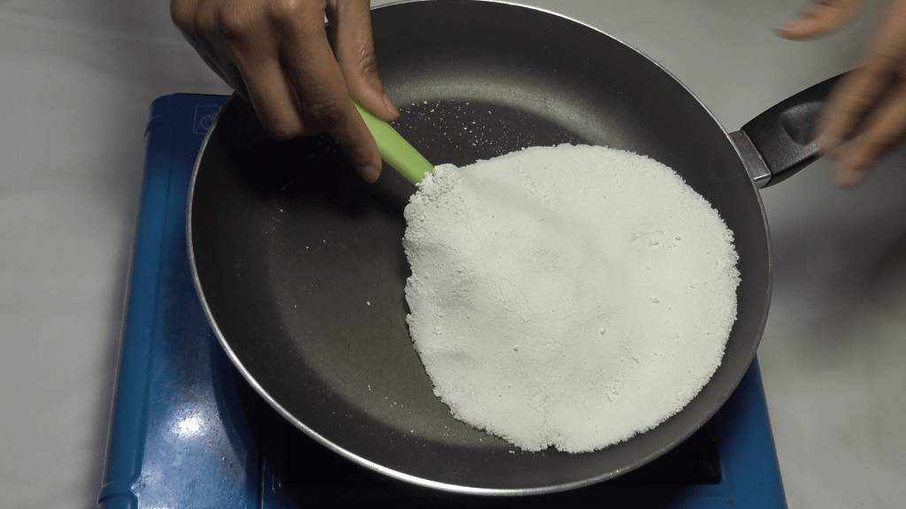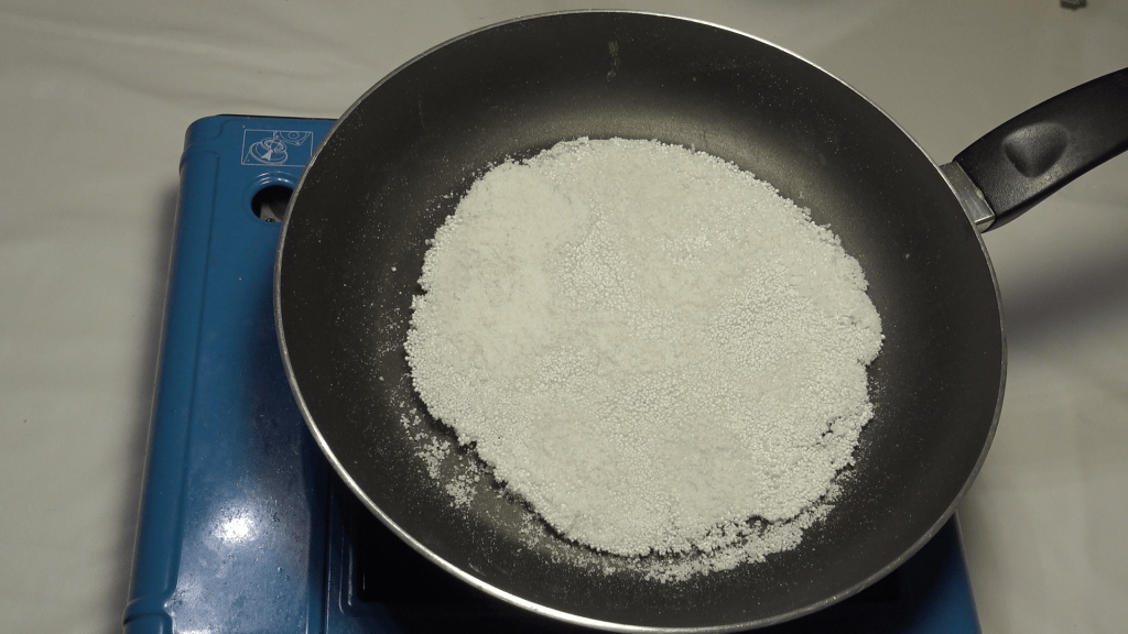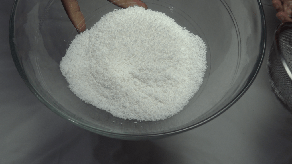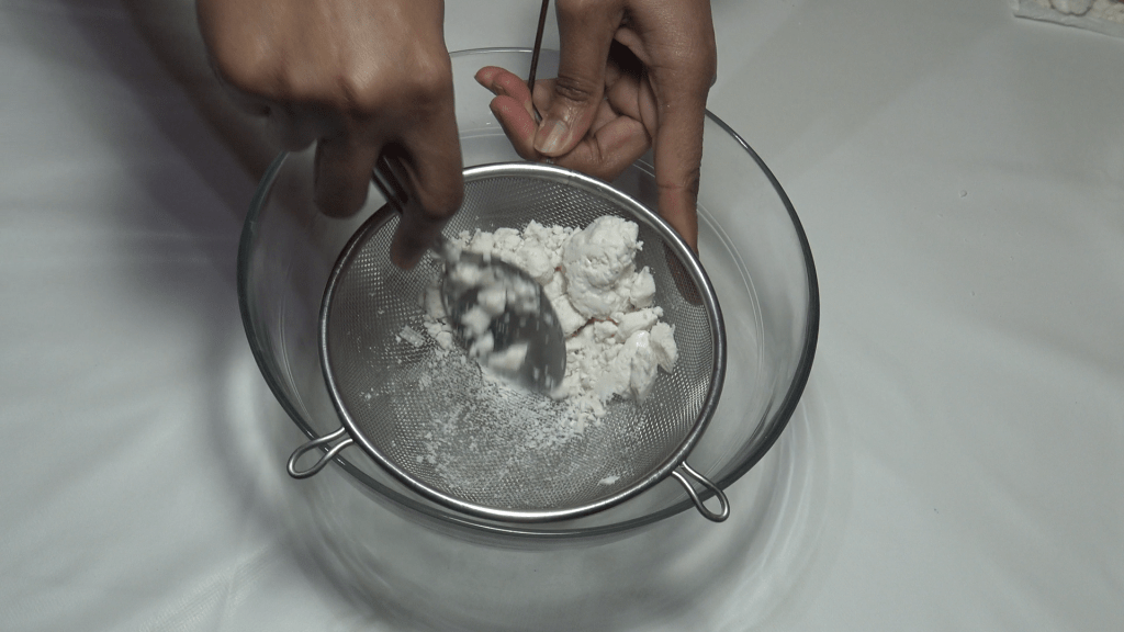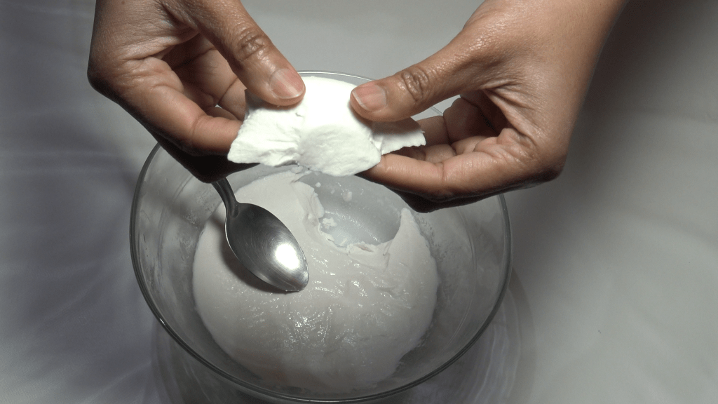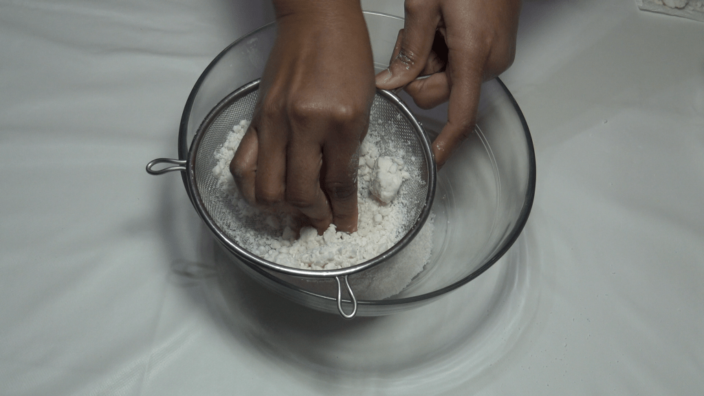 Passer la fécule désormais parfaitement hydratée dans un tamis ou une passoire à trous fins, ainsi on a obtenu de la gomme de manioc, ou gomme de tapioca.