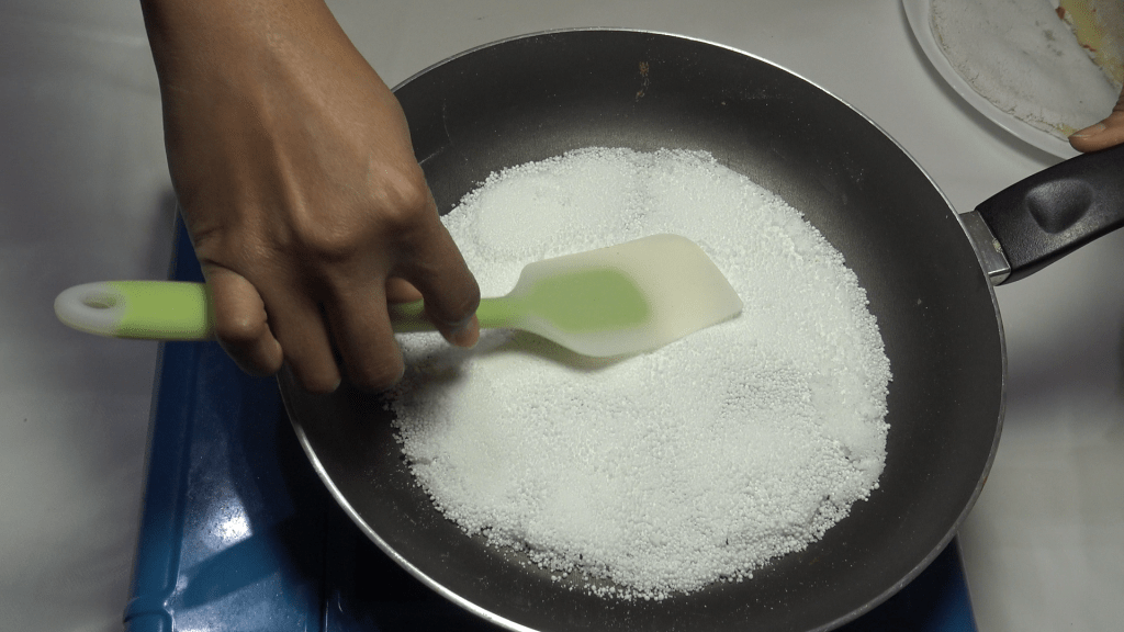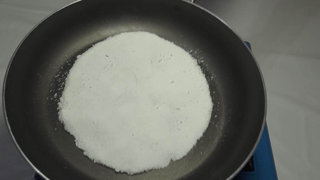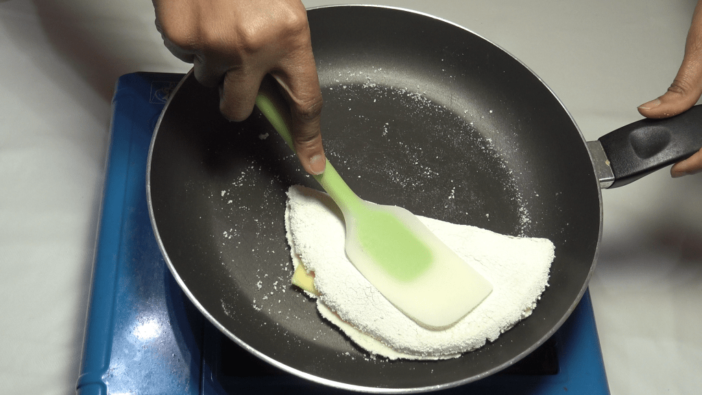 Une fois que la poêle est bien chaude, verser la gomme sur la poêle et bien l’étaler tout en la pressant un peu. Dès qu’elle commence à se décoller toute seule lorsque tu secoues la poêle c’est qu’elle est prête a être retournée.