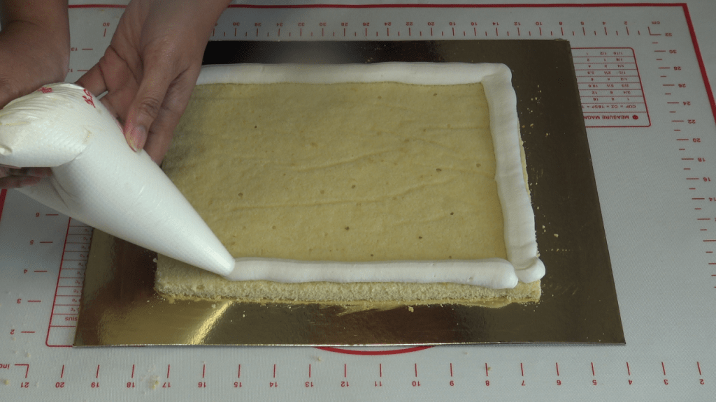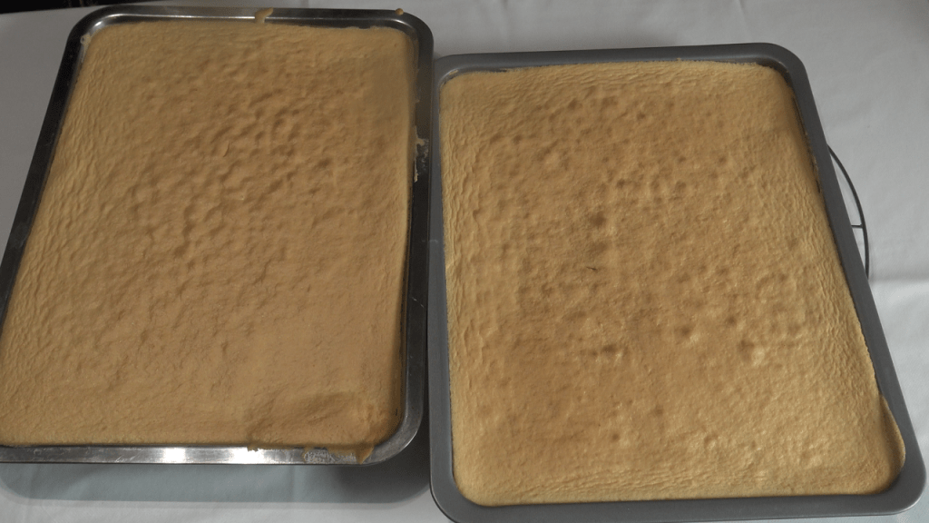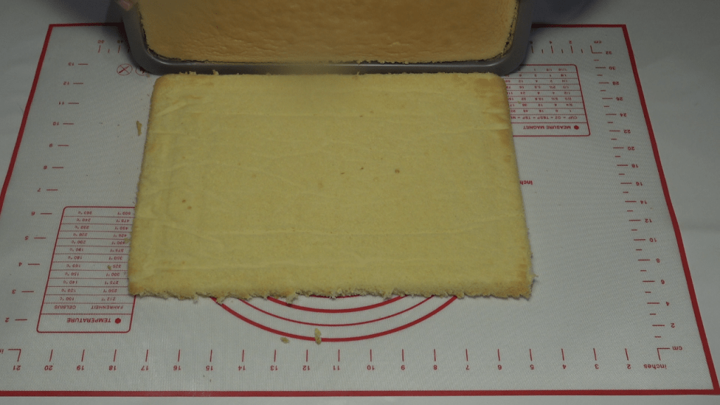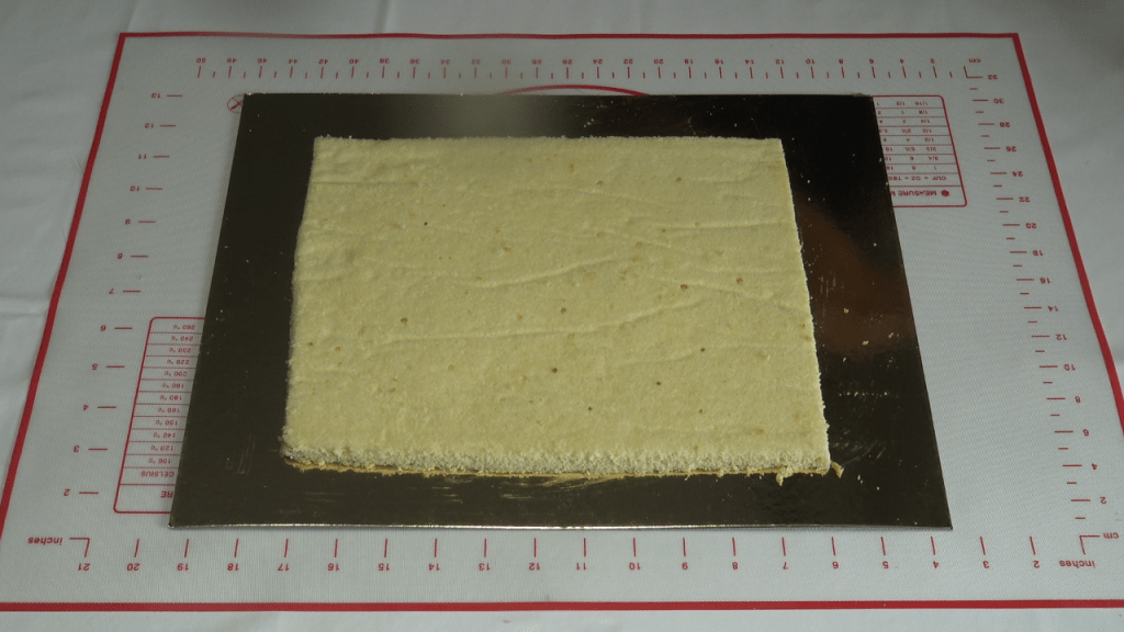 Préparer la génoise et la cuire 10 à 15 minutes à 180°c dans un moule chemisé d’environ 40 cm de longueur x 30 cm de largeur x 5 cm de hauteur