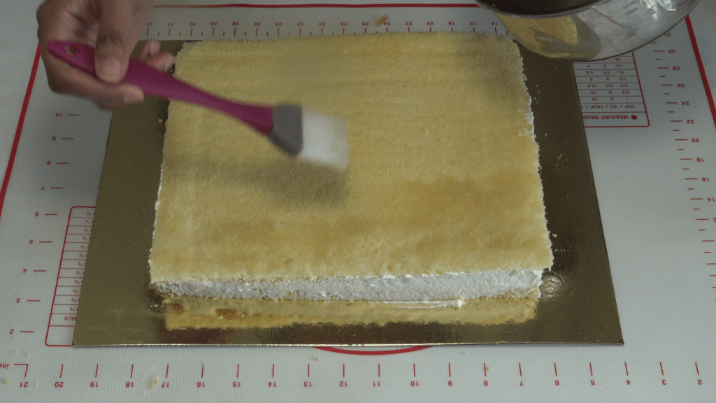 Disposer la 1ere génoise sur un plateau à gâteau, et l’imbiber de sirop de punchage