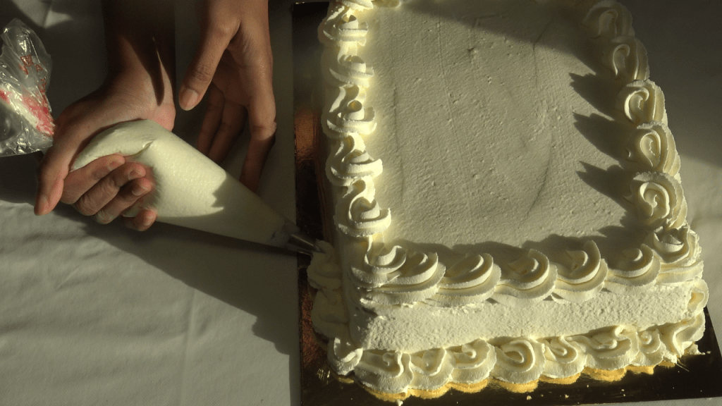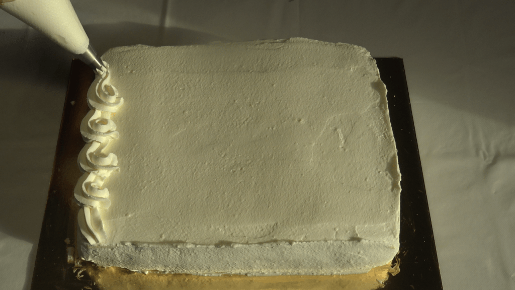Mettre une autre partie de crème dans une poche avec douille cannelée et enfin le reste de la crème servira à recouvrir le gâteau.