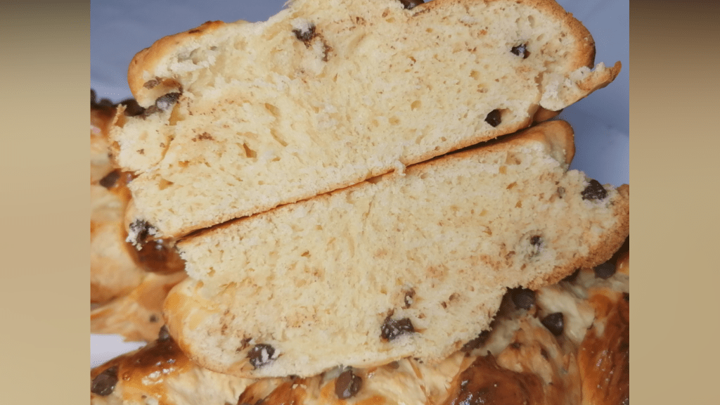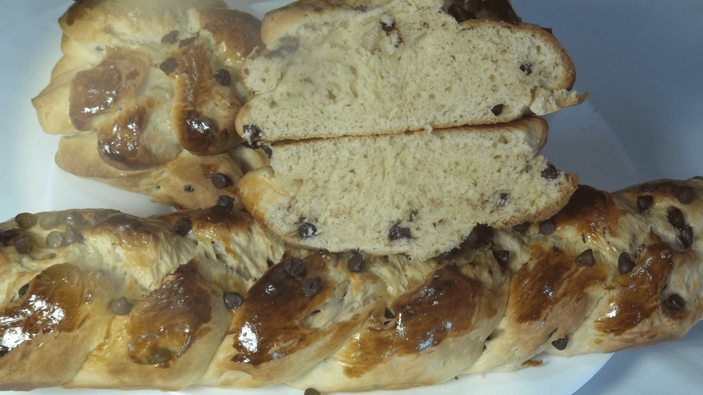 Passer un peu de dorure (le jaune d’œuf) et rajouter quelques pépites de chocolat sur le dessus pour encore plus de gourmandise.
