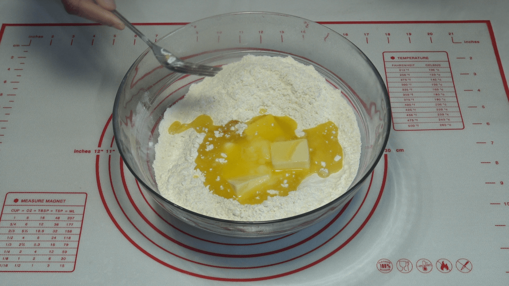 Creuser un puits et y verser le beurre pommade, les œufs, et le lait.