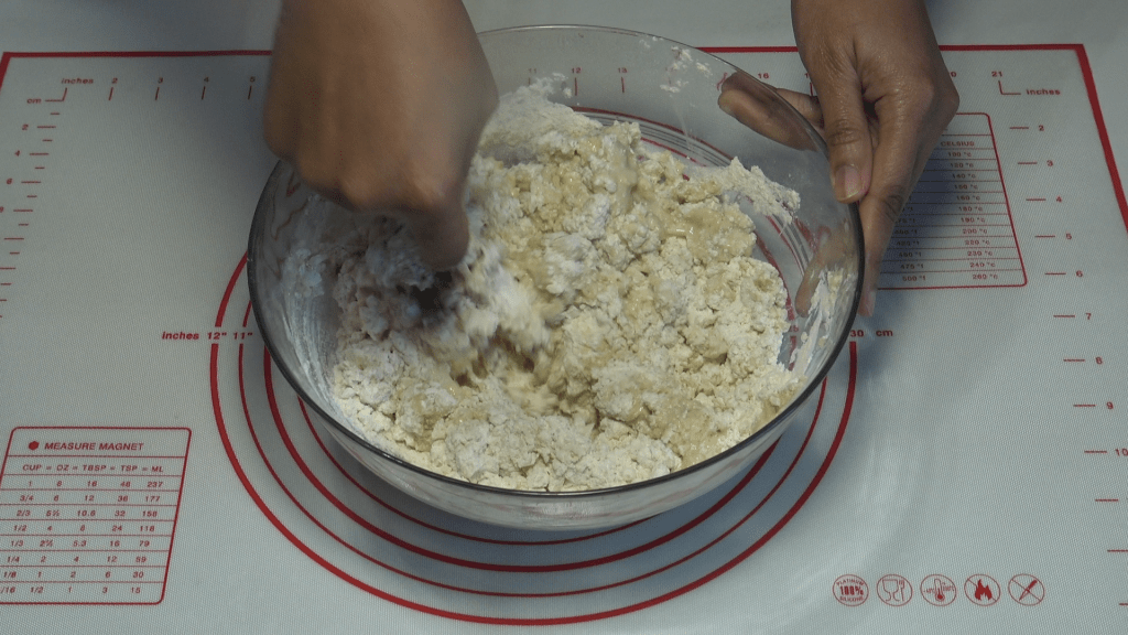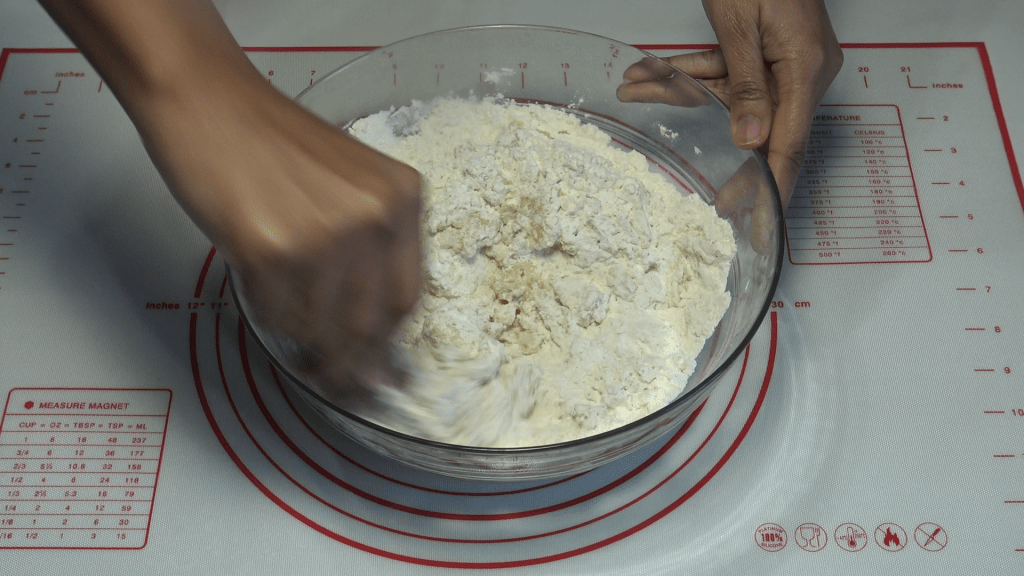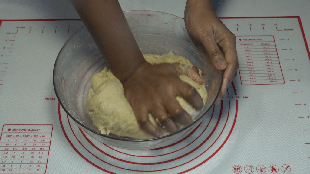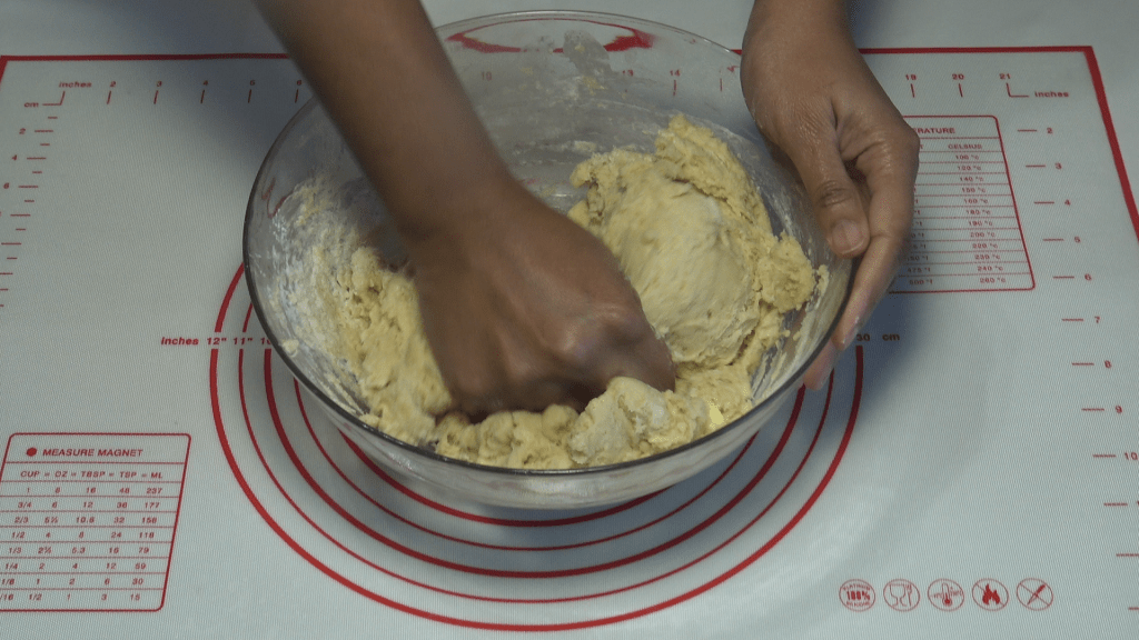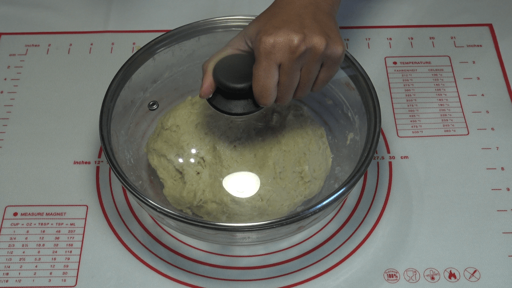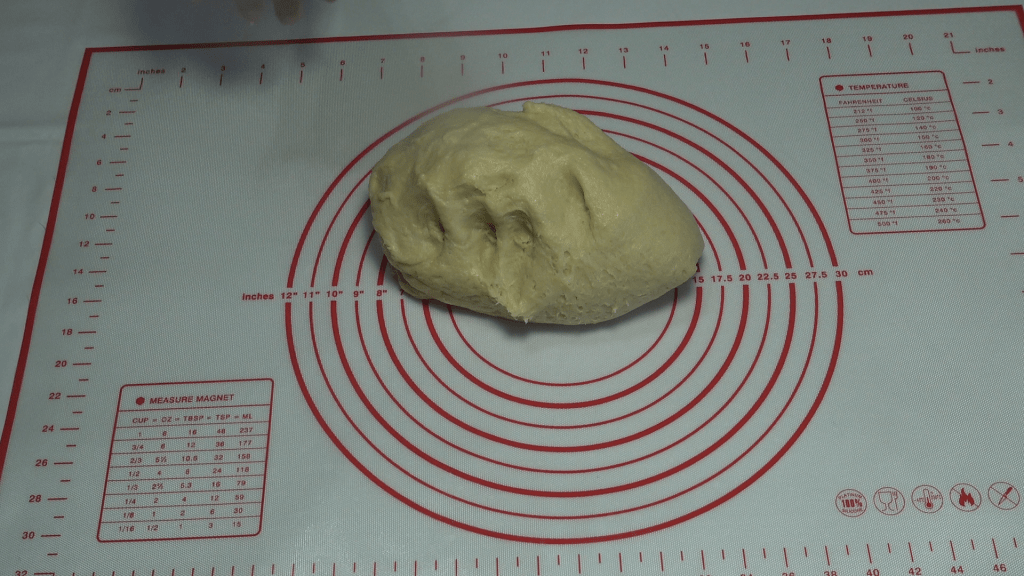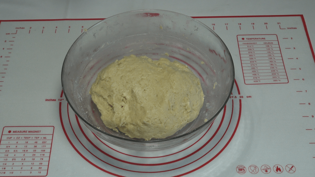 La pâte est collante et c’est normal. Après un bon pétrissage il est temps de laisser notre pâte reposer pour 30 min, recouverte d’un torchon propre ou de film alimentaire dans un endroit tiède et humide.