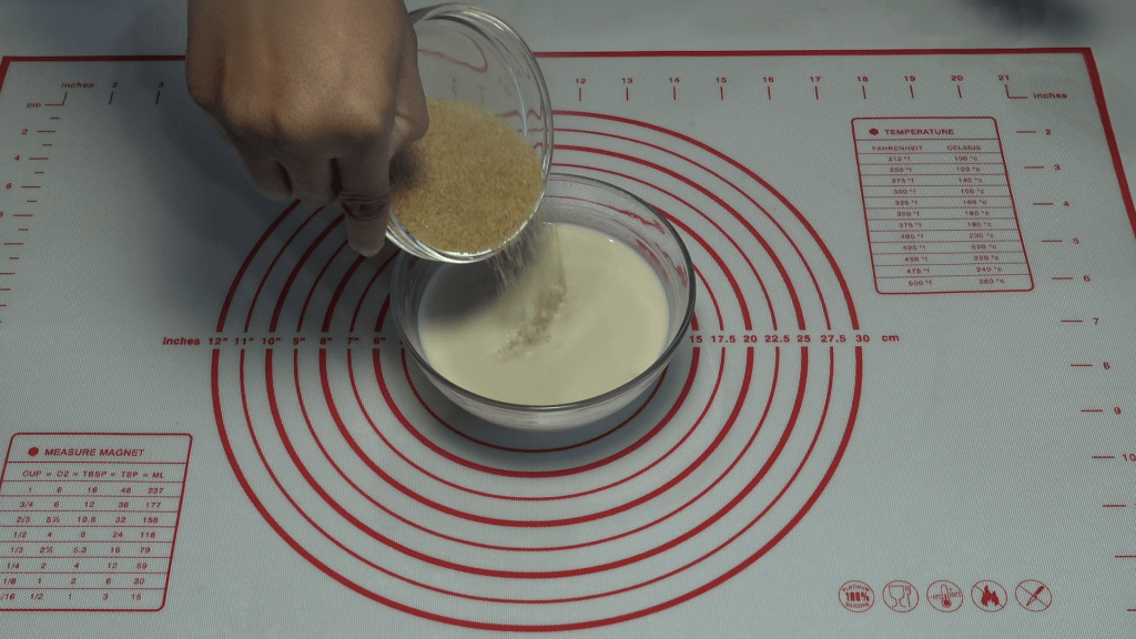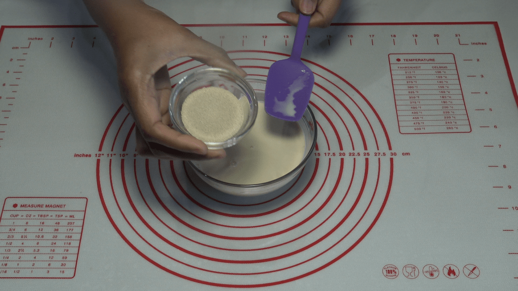 Commencer par délayer une partie du sucre et la levure dans le lait tiède.