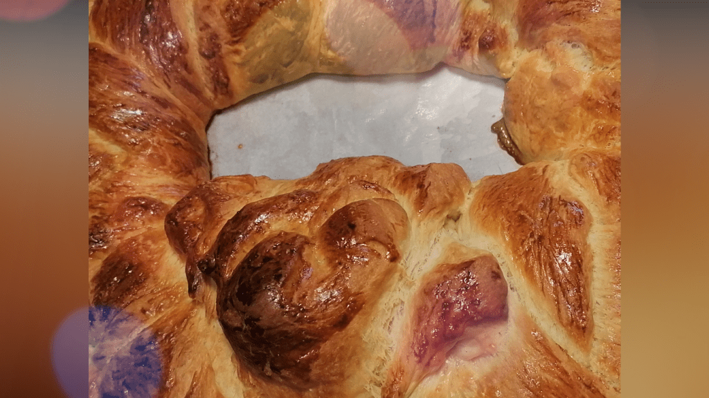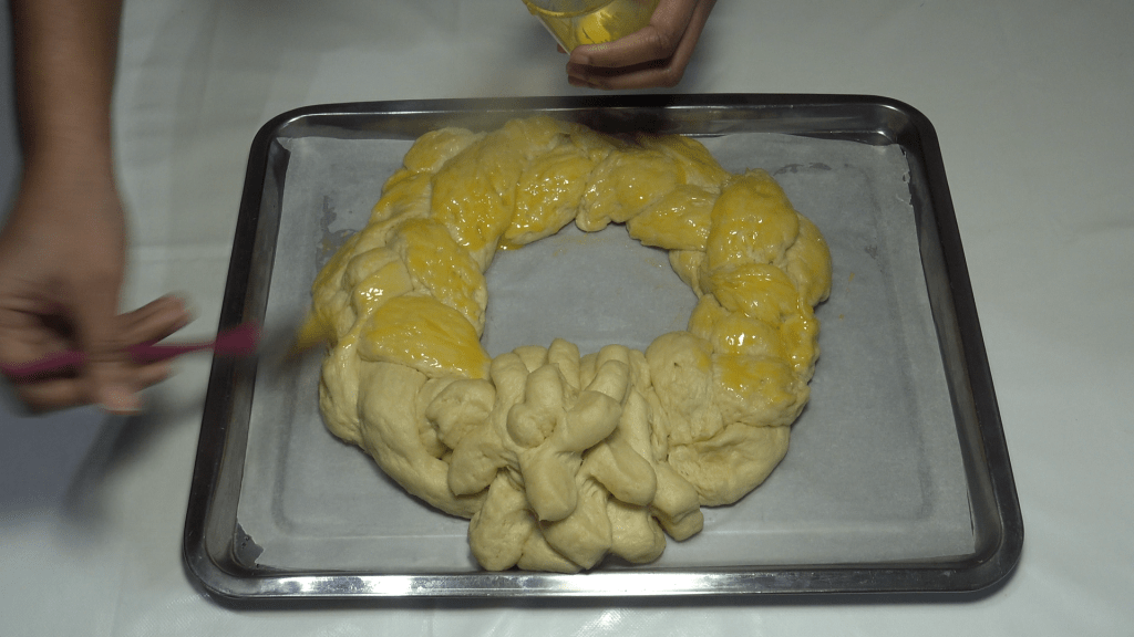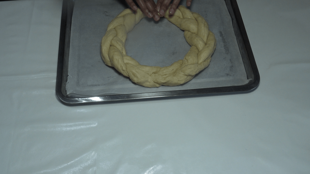 Disposer le tout en forme de couronne ou de forme souhaitée et laisser lever 10 min. Pendant ce temps, faire chauffer le four à 180°c.