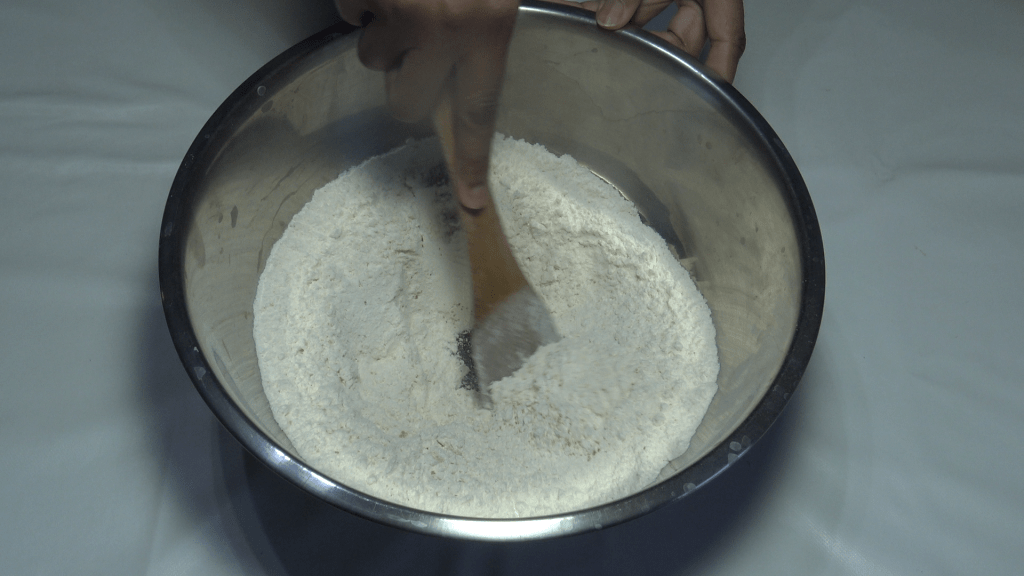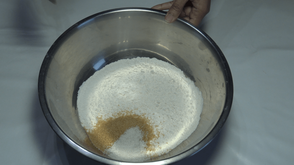 Dans un saladier, mettre la farine, le sel, le sucre et bien les mélanger.