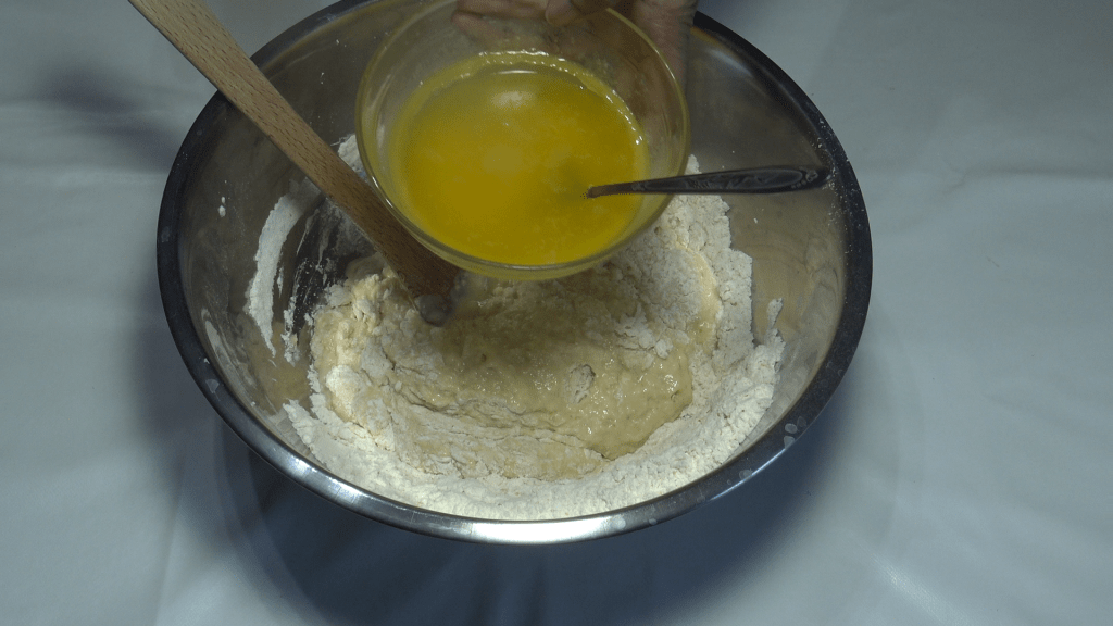 Creuser un puits et y verser le beurre fondu, les œufs, et le lait.