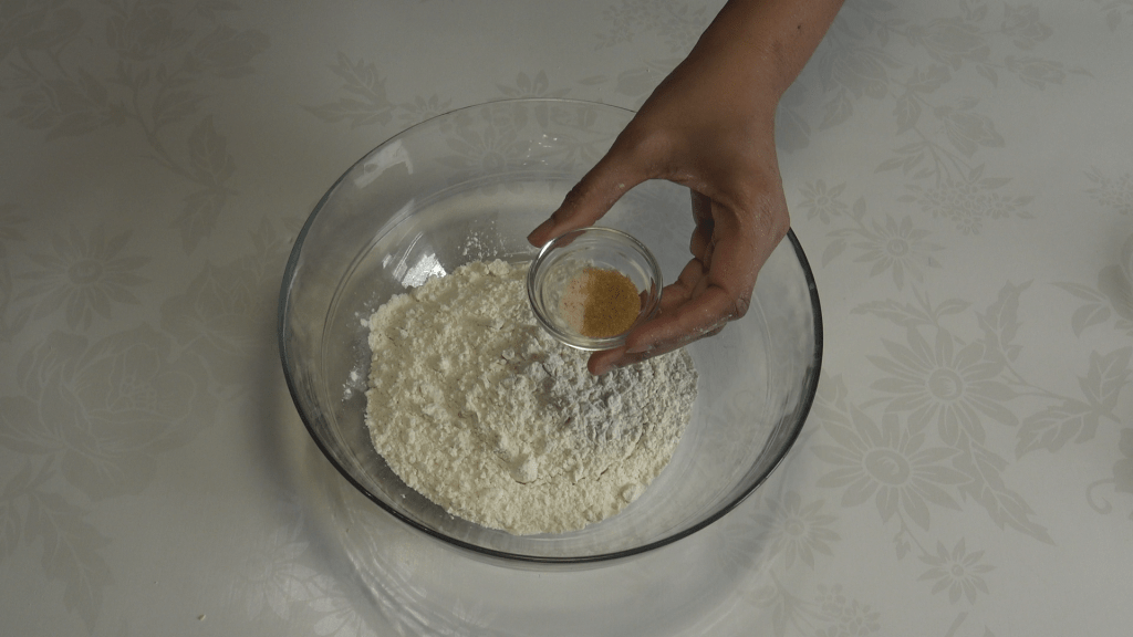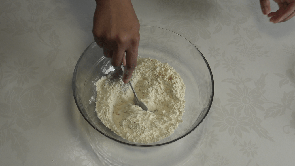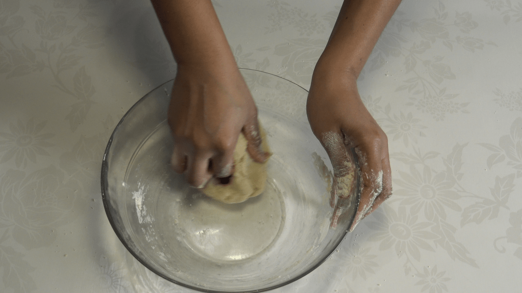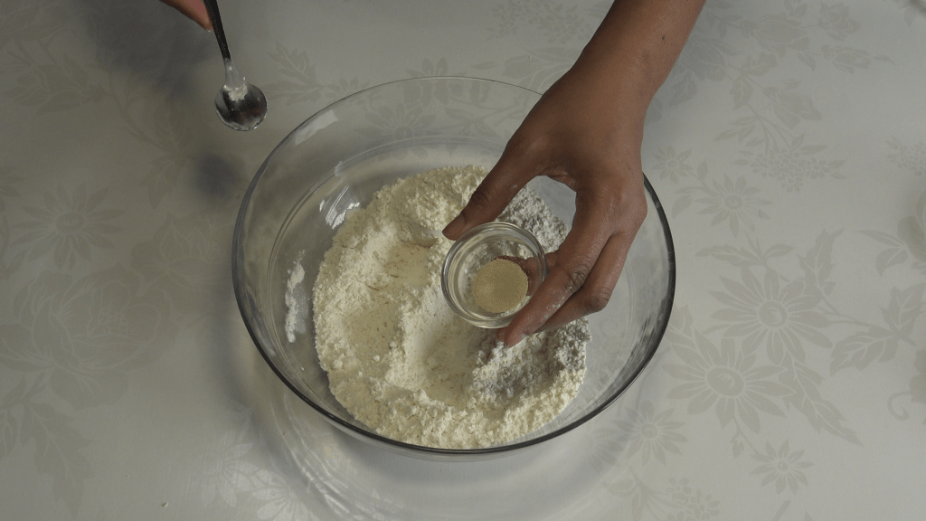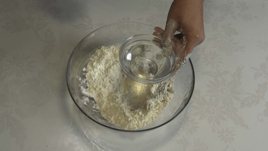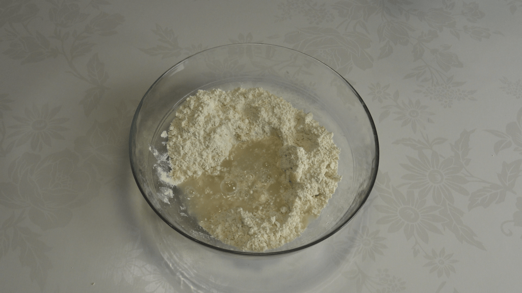 Mélanger la faine avec le sel et la levure, ensuite ajouter l’eau et bien pétrir la pâte.