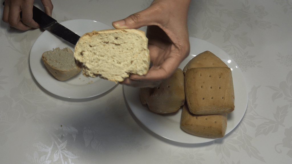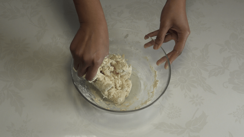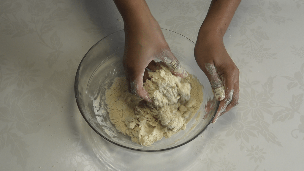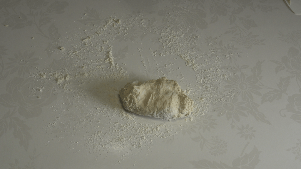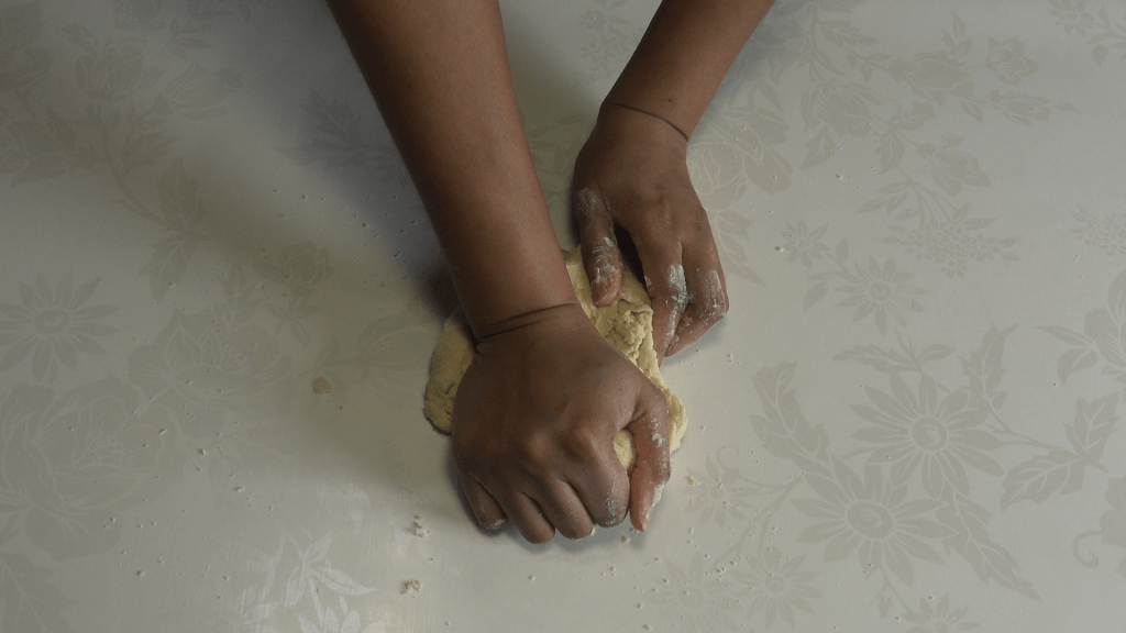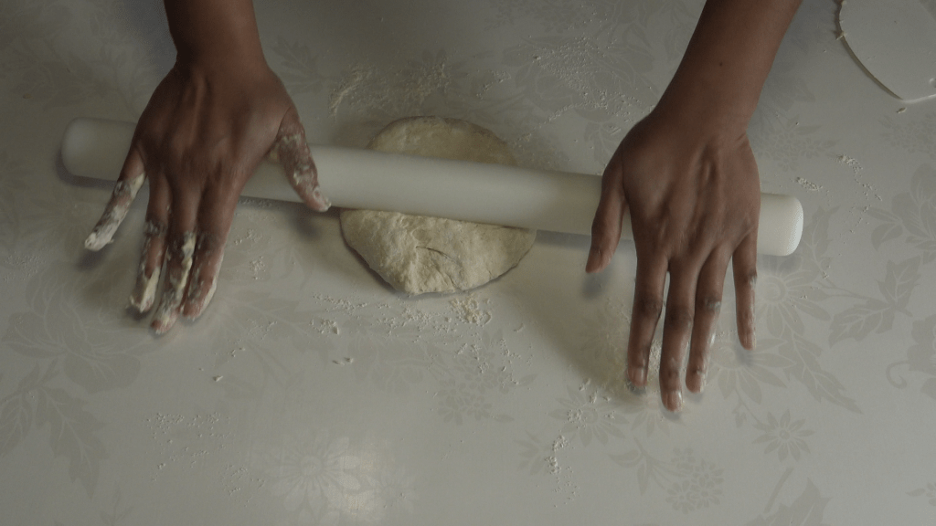 Mélanger la faine avec le sel et la levure, ensuite ajouter l’eau et bien pétrir la pâte.