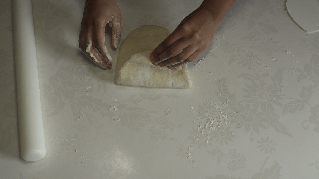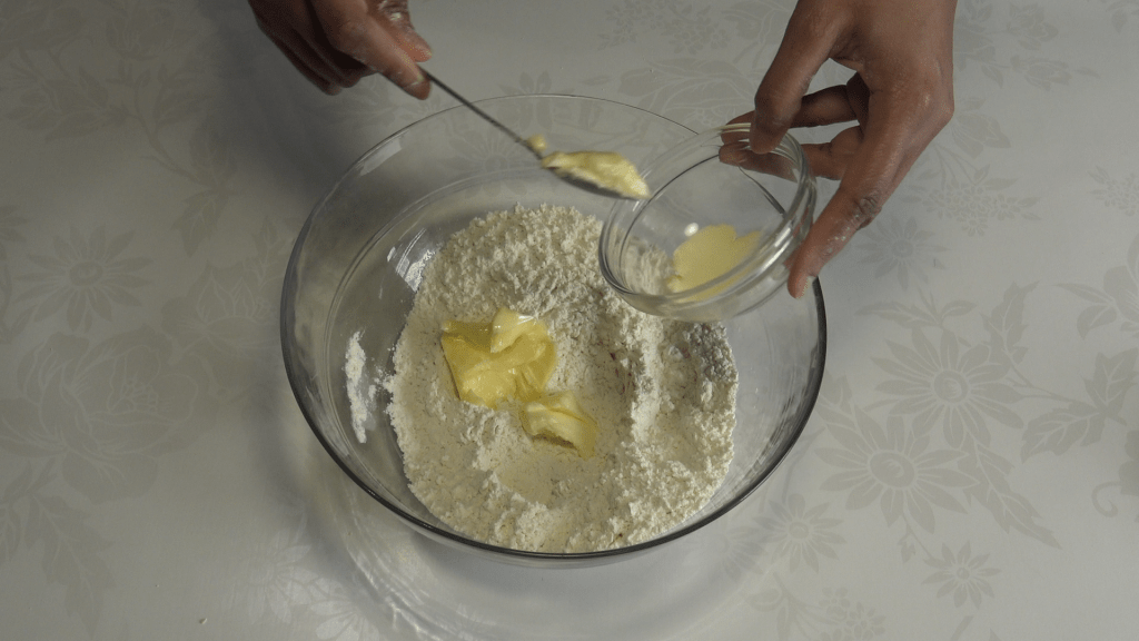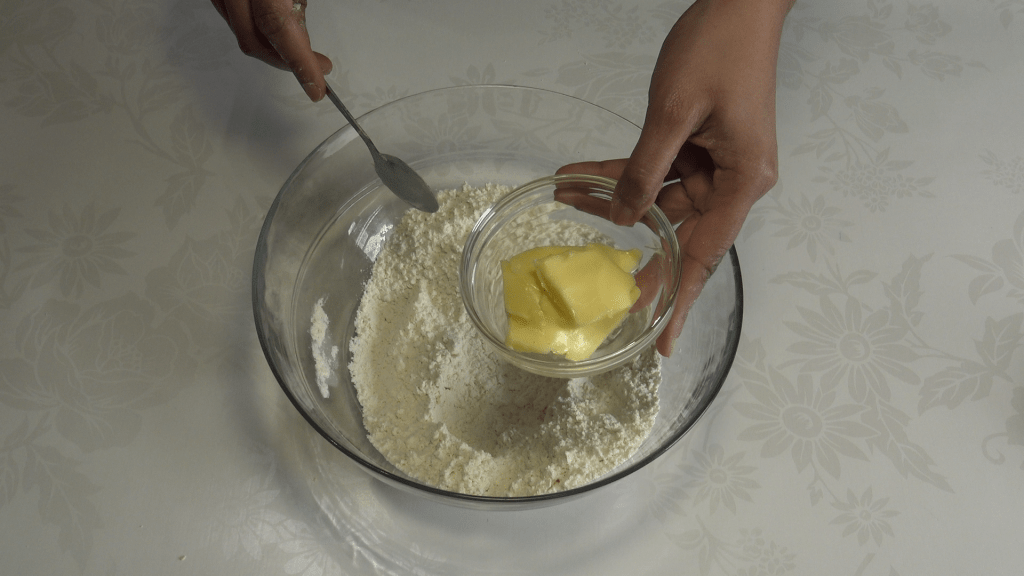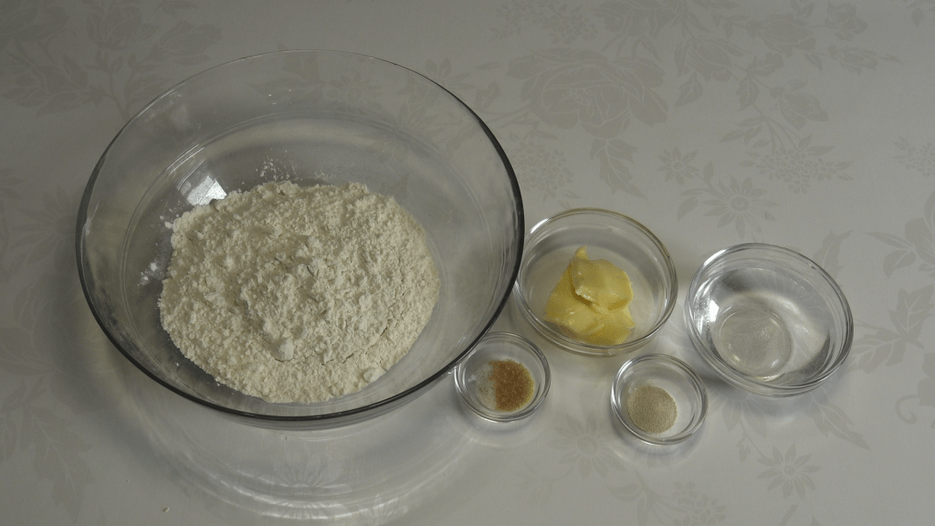 Mélanger la farine avec le sel, le sucre et la levure, ensuite ajouter l’eau et le beurre et bien pétrir la pâte.
