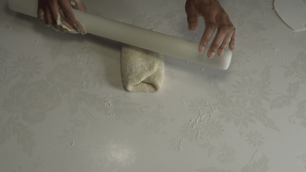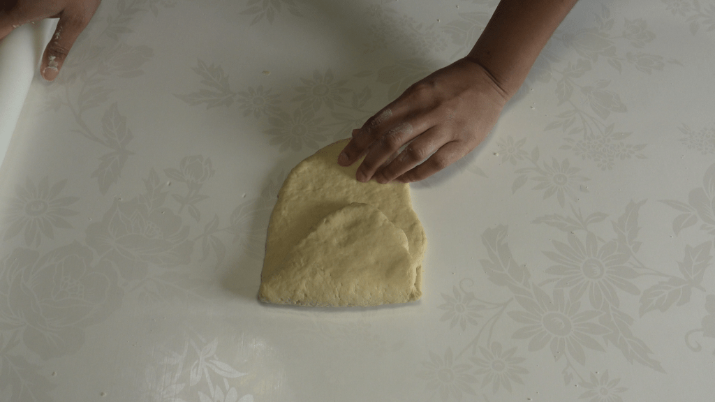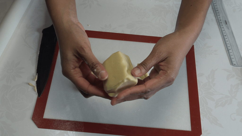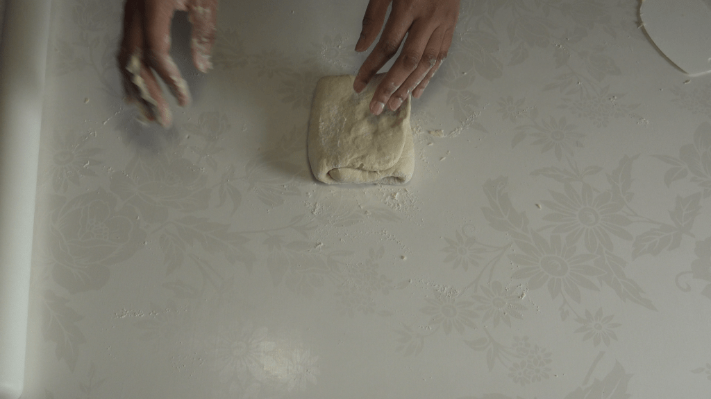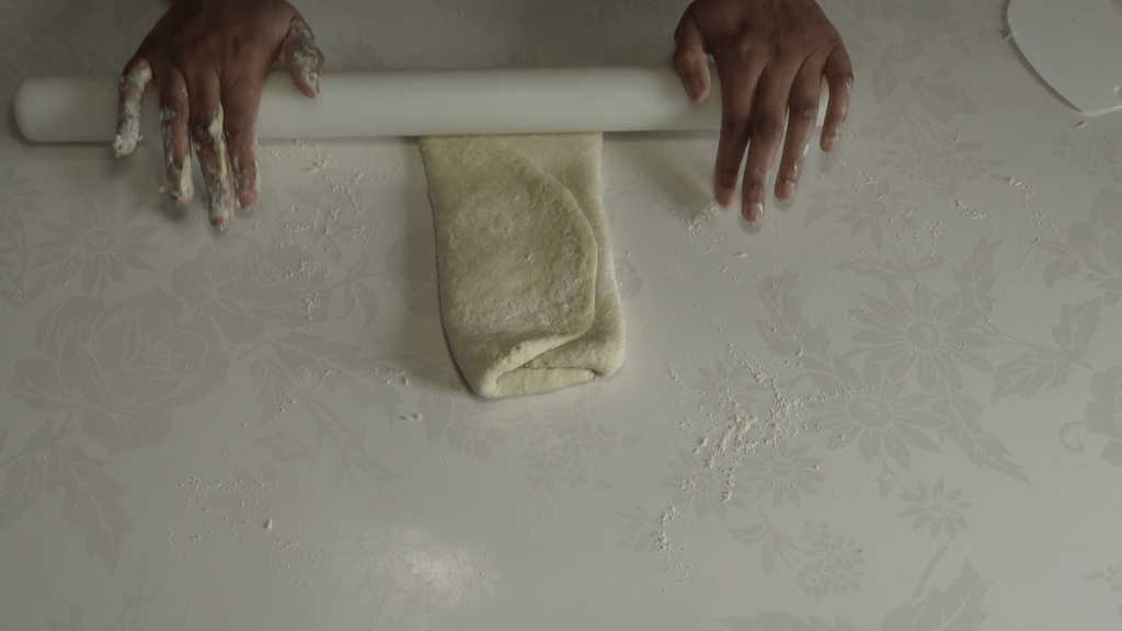 Etaler la pâte et la replier sur elle-même plusieurs fois comme pour faire une pâte feuilletée.